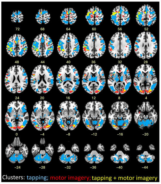 - Gerardin, E.; Sirigu, A.; Lehericy, S.; Poline, J.B.; Gaymard, B.; Marsault, C.; Agid, Y.; Le Bihan, D. Partially overlapping neural networks for real and imagined hand movements. Cereb. Cortex 2000, 10, 1093–1104. [Google Scholar] [CrossRef]