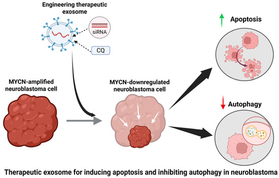 There have been earlier preclinical studies about the effectiveness of using siRNA to knock down MYCN expression in high-risk MYCN-amplified tumors in inhibiting tumor growth [163]. The instability of siRNA makes this difficult, but the lipid bilayer of exosomes provides the stable environment necessary for the therapeutic siRNA to be safely delivered to the tumor [164,165]. Autophagy is another method commonly used by NB to promote survival and growth. It is often activated when the cell is in distress including when the MYCN gene is knocked down [166]. Autophagy inhibitors including CQ have been used in NB to block drug resistance and suppress tumor growth [167]. Therefore, pairing the siRNA to knock down MYCN with an autophagy inhibitor will increase the efficiency of the NB treatment.