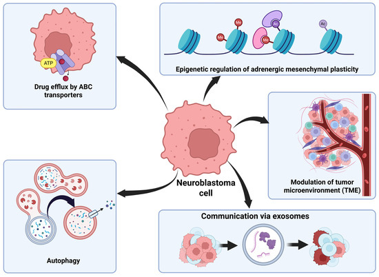 NB has several mechanisms of drug resistance. ABC transporters are used to export chemotherapeutic agents from cells to avoid their damage. Autophagy is a process used to degrade damaged organelles or harmful proteins for efficient recycling to increase cell survival in strenuous conditions. Epigenetic regulation allows for NB cells to transition between adrenergic and mesenchymal cell types with different properties depending on the characteristics of the tumor environment. NB cells can modify the TME by secreting factors to inhibit immune cells. NB cells use exosomes to communicate with surrounding cells and transfer oncogenic material between cells. This figure was created using BioRender.