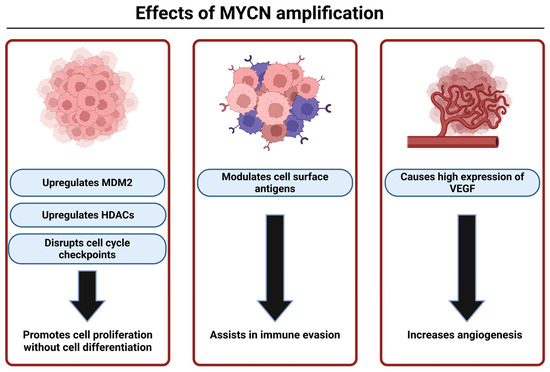 As mentioned earlier, MYCN is the oncogene mostly found to be associated with high-risk NB. It is present in an estimated 20–30% of all NB and 50% of high-risk NB [9]. MDM2 is upregulated by MYCN, which leads to inhibition of p53 allowing for increased cell proliferation in the tumor [58]. MYCN can also promote tumor growth by disrupting the cell cycle checkpoints causing uncontrolled cell proliferation. It can modulate the expression of the antigens on the NB cell surface, helping it with immune evasion. MYCN amplification is also associated with high-level activation of the PI3K/Akt/mTOR pathway, which produces vascular endothelial growth factor (VEGF) for angiogenesis that assists in tumor survival. MYCN also upregulates histone deacetylases (HDACs) to inhibit differentiation and silence tumor suppressor genes [108]. Overall, MYCN plays a significant role in fostering pro-survival mechanisms in MYCN-amplified NB (Figure 3).
