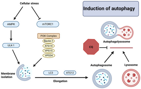 Cellular stress causing induction of autophagy in NB cells. AMPK phosphorylates ULK-1, which alongside the PI3K complex forms the isolation membrane. The membrane is expanded by LC3 and ATG12 to form the autophagosome. The autophagosome fuses with the lysosome to begin degradation of autophagosome contents. Chloroquine (CQ) is a known autophagy inhibitor that targets the fusion of the autophagosome to lysosome. This figure was created with BioRender.
