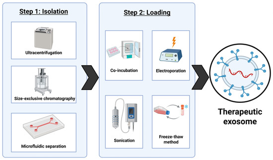 Ultracentrifugation is a common method of isolation for large samples, but it risks structural damage to the exosomes along with high cost and time consumption. Size exclusion chromatography is much more cost efficient and faster, but it can compromise the purity of the batch of exosomes. Microfluidic methods are rapid and have the highest level of purity but require expensive equipment [142]. Currently, all methods of isolation of exosomes are both time consuming and costly, which is one of the biggest obstacles for the translation of this research into the clinical stages. The loading process can be completed at pre-secretion of the exosomes from the cell or post-isolation of the exosomes. Pre-secretion methods entail transfecting the parent cells with RNA that can then be packaged into exosomes to be released. A pre-selection method is not preferred due to its inability to track loading efficiency [143]. Post-isolation methods include co-incubation, electroporation, sonication, and the freeze–thaw. Co-incubation is not disruptive to the exosome membrane but as a result, it is only effective for small hydrophobic molecules. Both electroporation and sonication are methods that increase membrane permeability for small hydrophilic molecules including RNA and proteins, but both risk compromising integrity of the exosome membrane. The freeze–thaw method is effective for loading drugs into exosomes, but it must be performed in careful conditions to avoid damaging the exosomes beyond use [144]. There are also no high-yield methods of loading the exosomes, which is another obstacle to large-scale production and clinical implementation of this research. Any process is expensive to produce loaded exosomes, providing a relatively low percentage of pure and usable exosomes. This process would need to be streamlined and made cost-effective for exosomes to replace current therapeutic techniques.