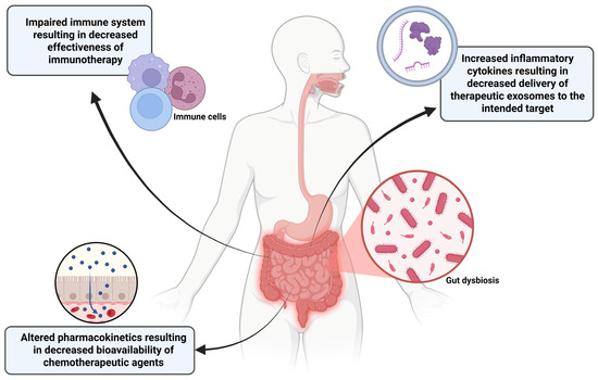 Dysbiosis of gut microbiome has multiple implications for reducing the efficacy of cancer treatments. Success rates of immunotherapy treatments can be impacted due to a diminished host immune response. Altered metabolism and absorption of chemotherapeutic drugs can decrease the dose that reaches the tumor. A dysbiotic gut increases the release of inflammatory cytokines including IL-6 that can induce macrophages in the bloodstream to take up therapeutic exosomes causing fewer to arrive at the tumor site. This figure was created using BioRender.