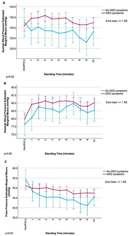 Autonomic signs did not differ significantly by DED symptom status, including frequencies of OH and POTS, HRV metrics (Table 2), and changes in SBP, DBP, PP, and HR (Figure 1) over time.
