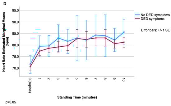 Change in cardiovascular parameters (systolic blood pressure, diastolic blood pressure, pulse pressure, heart rate) during the NASA lean test, grouped by dry-eye disease (DED) symptom status. (A) Systolic blood pressure over time in DED vs. non-DED symptom groups. (B) Diastolic blood pressure over time in DED vs. non-DED symptom groups. (C) Pulse pressure over time in DED vs. non-DED symptom groups. (D) Heart rate over time in DED vs. non-DED symptom groups.