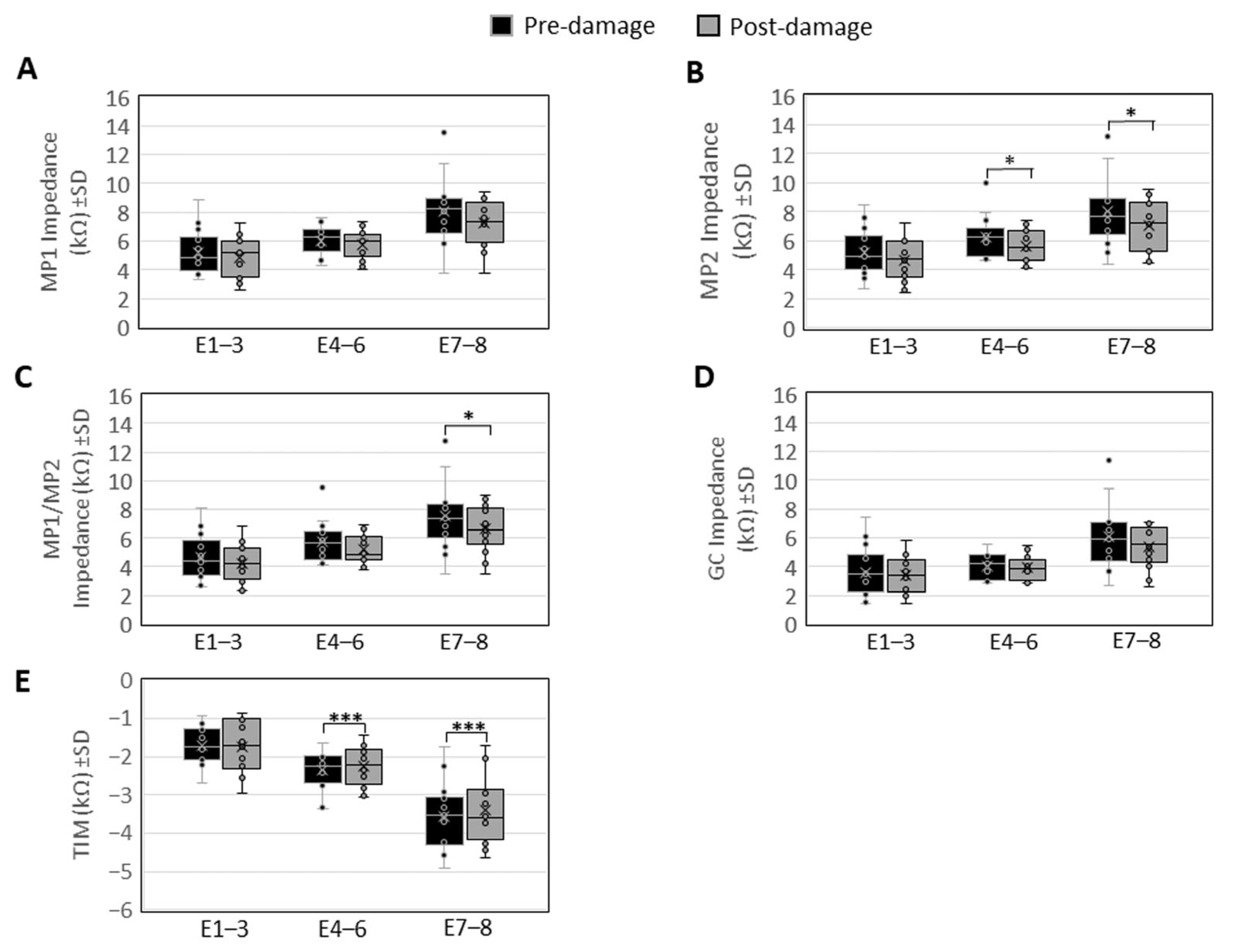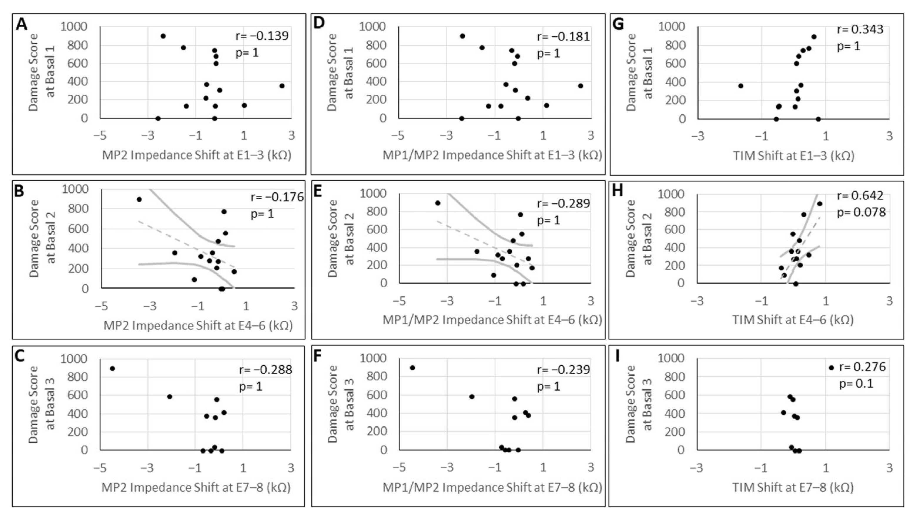 3.4. Correlation Analysis of Impedance and TIM Shifts with the Extent of Modiolar Damage