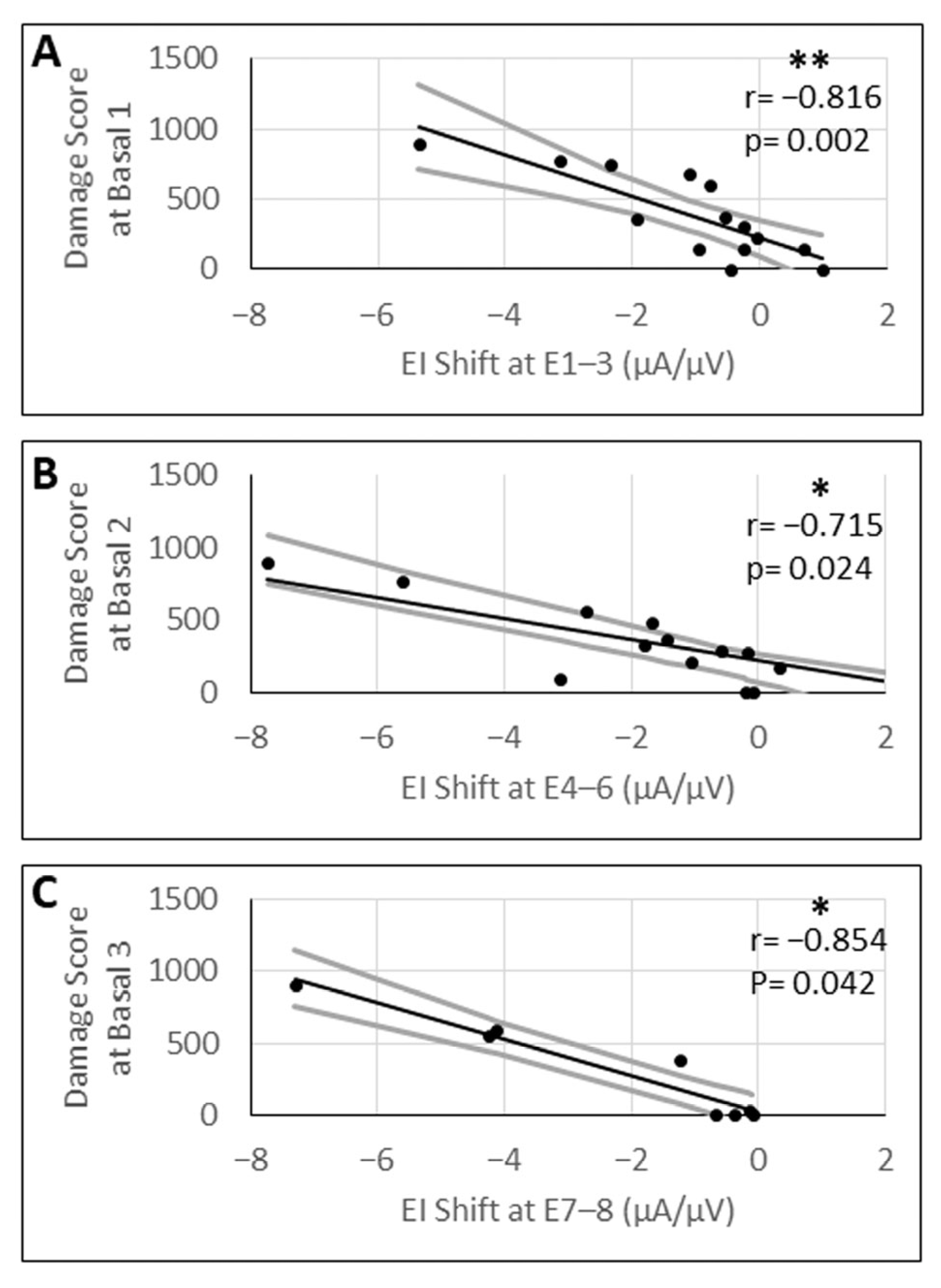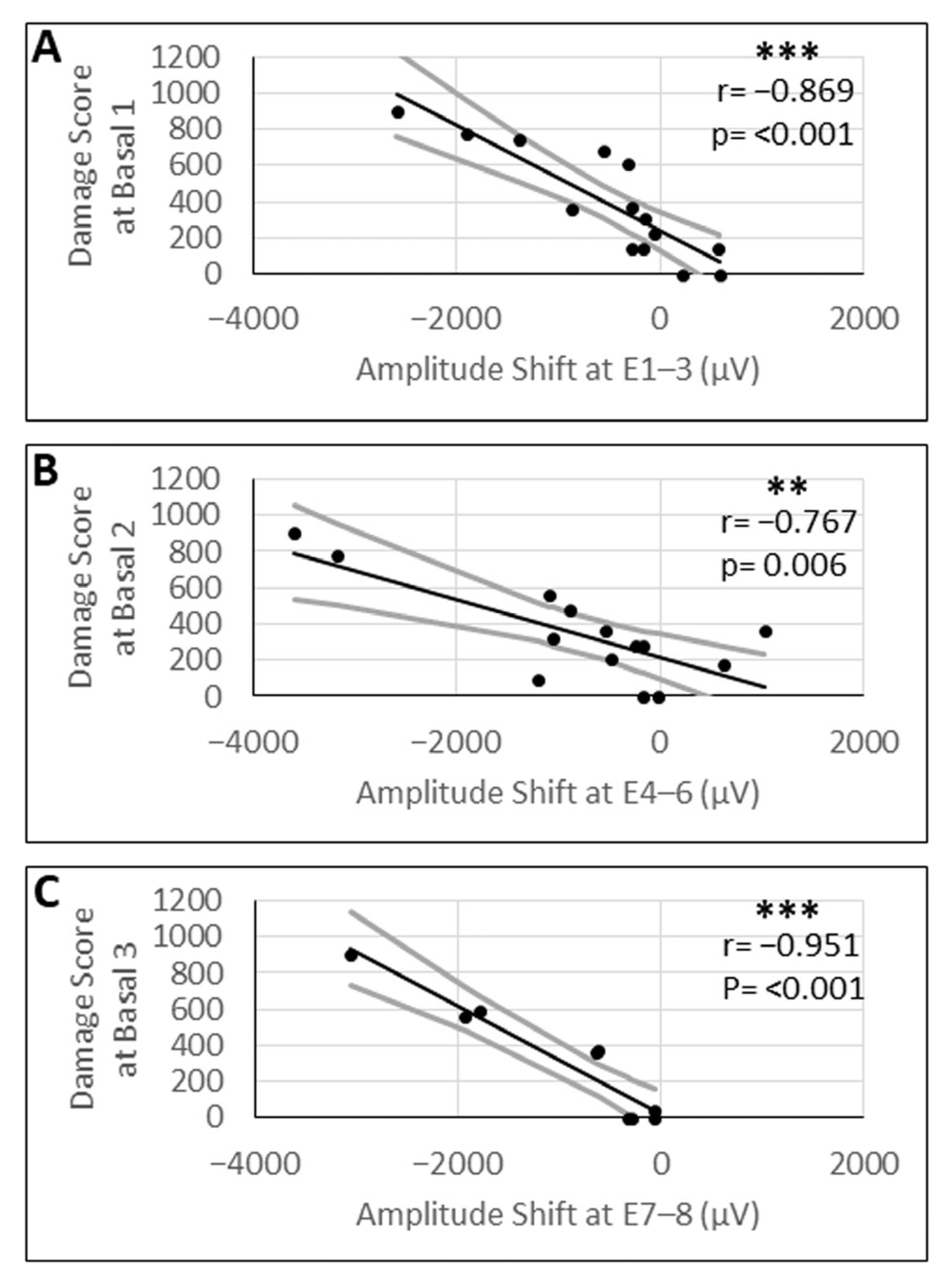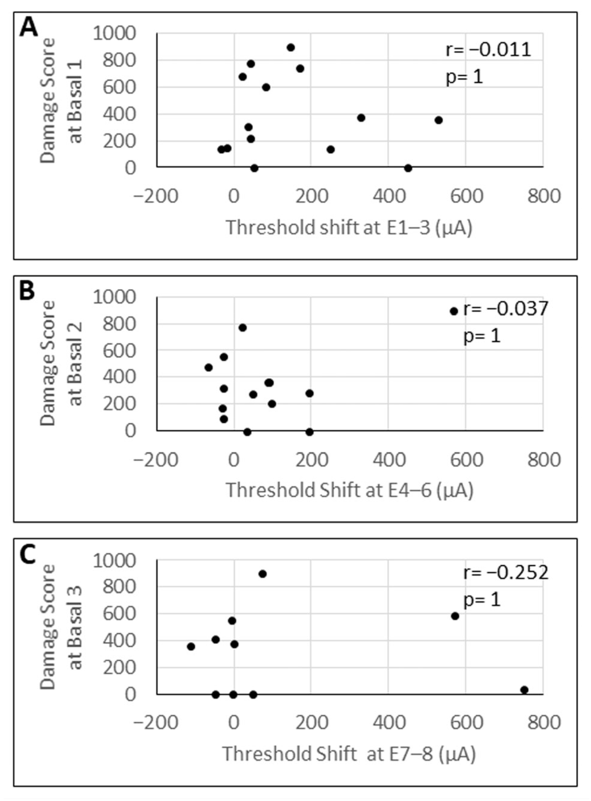 3.5. Correlation Analysis of eCAP Threshold Shifts with Damage Scores