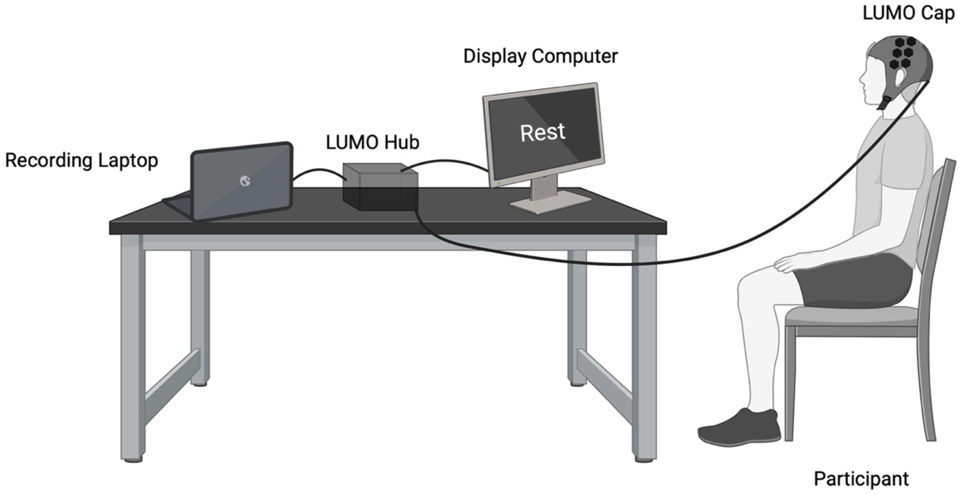 Visual written cues indicating the current block type (“Rest” or “Finger Tapping”) were presented using PsychoPy (v2024.2.24) on a 14-inch laptop positioned approximately 60 cm from the participant for the duration of the task. Prior to the start of the experiment, researchers provided verbal instructions and demonstrated the tapping procedure. Data collection took place in a private room at the University of Sheffield or in the Royal Hallamshire Hospital Biomedical Research Centre. The experimental set-up is illustrated in Figure 2.