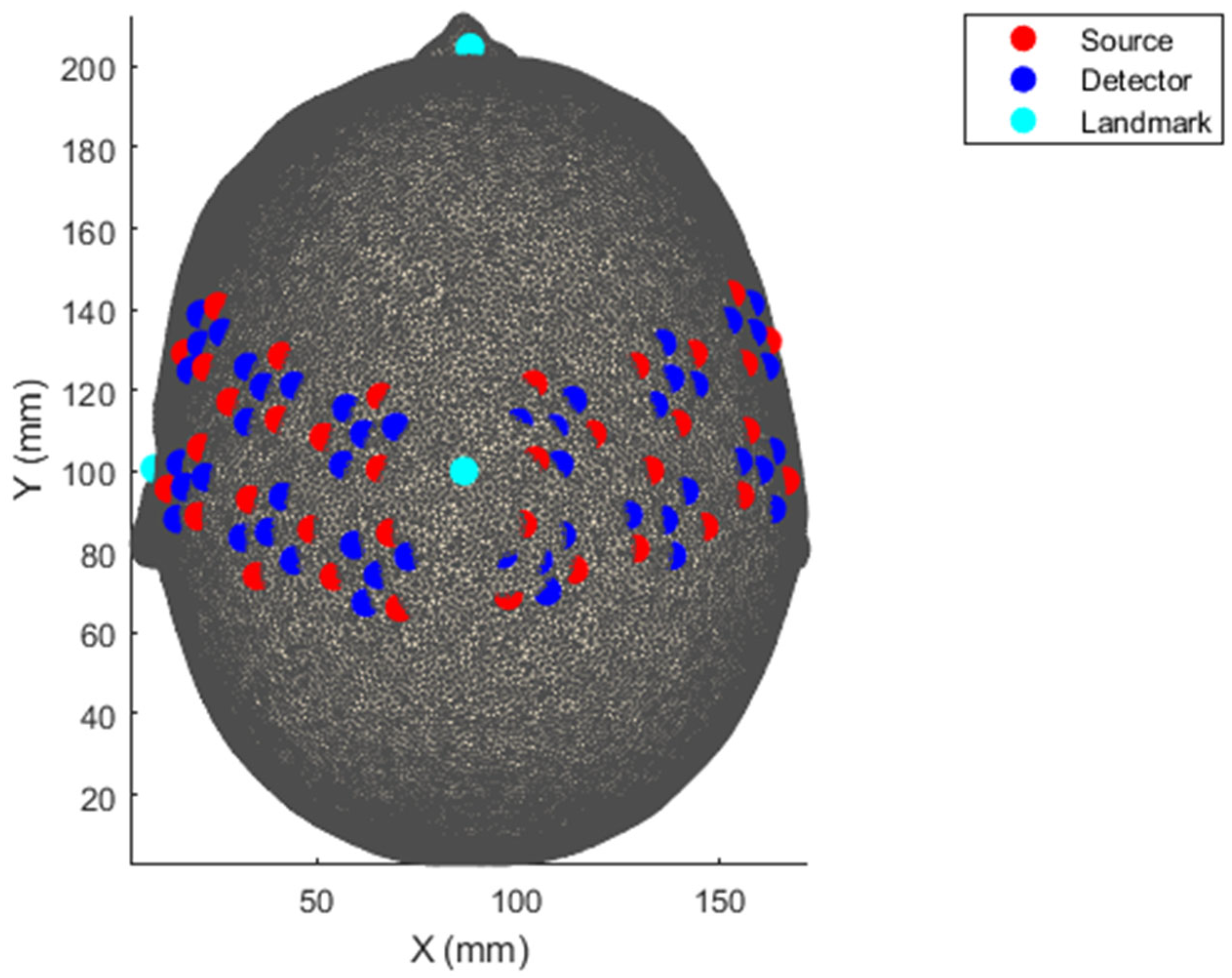 Figure 3. Source–Detector Registration to template brain showing locations of optodes and cranial landmarks using the assumed locations provided by the HD-DOT System.