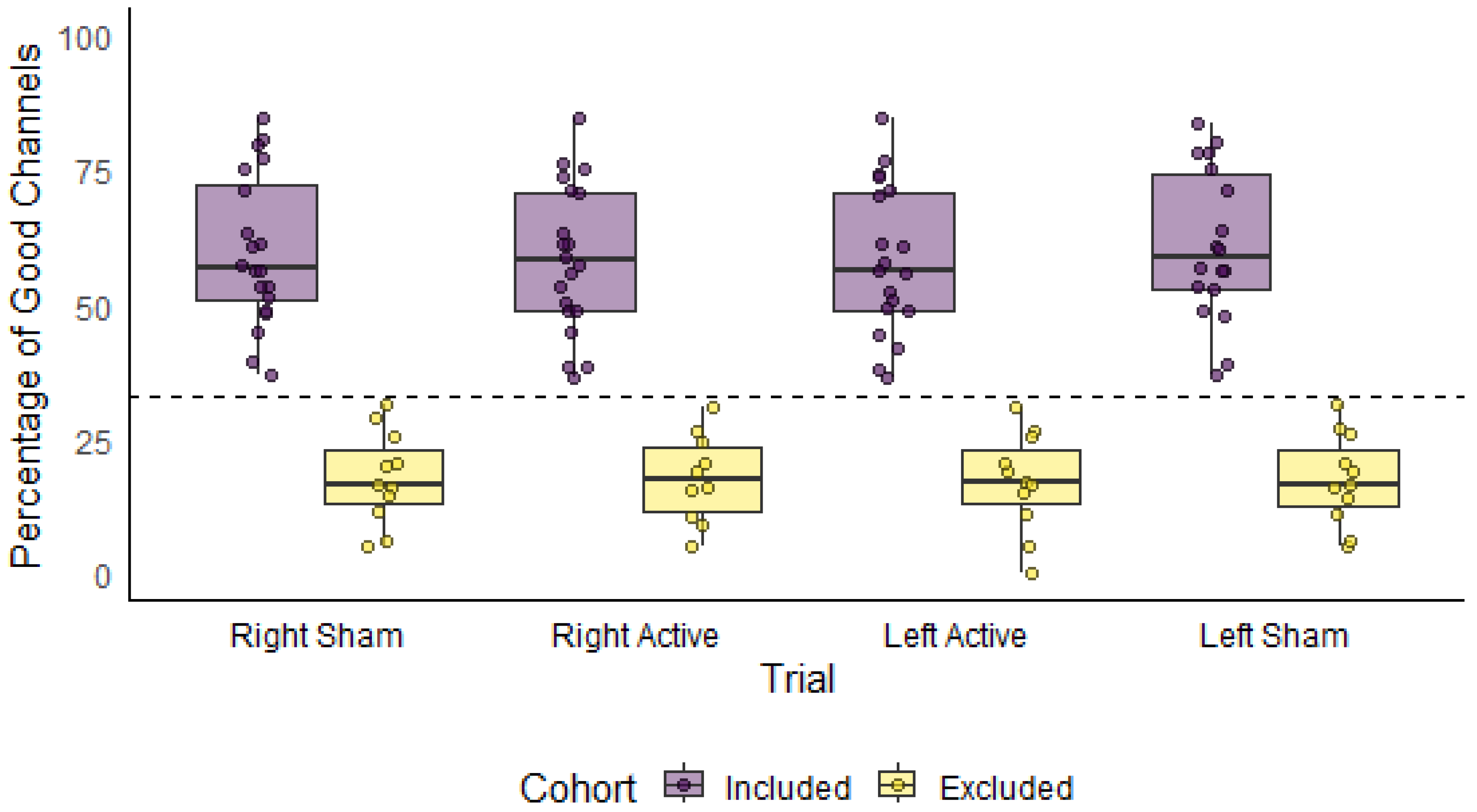 All participants completed the conditions within the same session and each condition was saved as a separate recording. Across condition recordings, the number of channels that met the pruning criteria varied, leading to some participants being excluded from some, but not all conditions. The characteristics for each cohort used in the group-level analyses are reported in Table 1. Figure 8 illustrates the percentage of good quality channels by condition, stratified by included and excluded participants. After exclusion, the average number of good channels across participants did not significantly differ between conditions (F(3) = 0.18, p = 0.91) (see Supplementary Table S1).