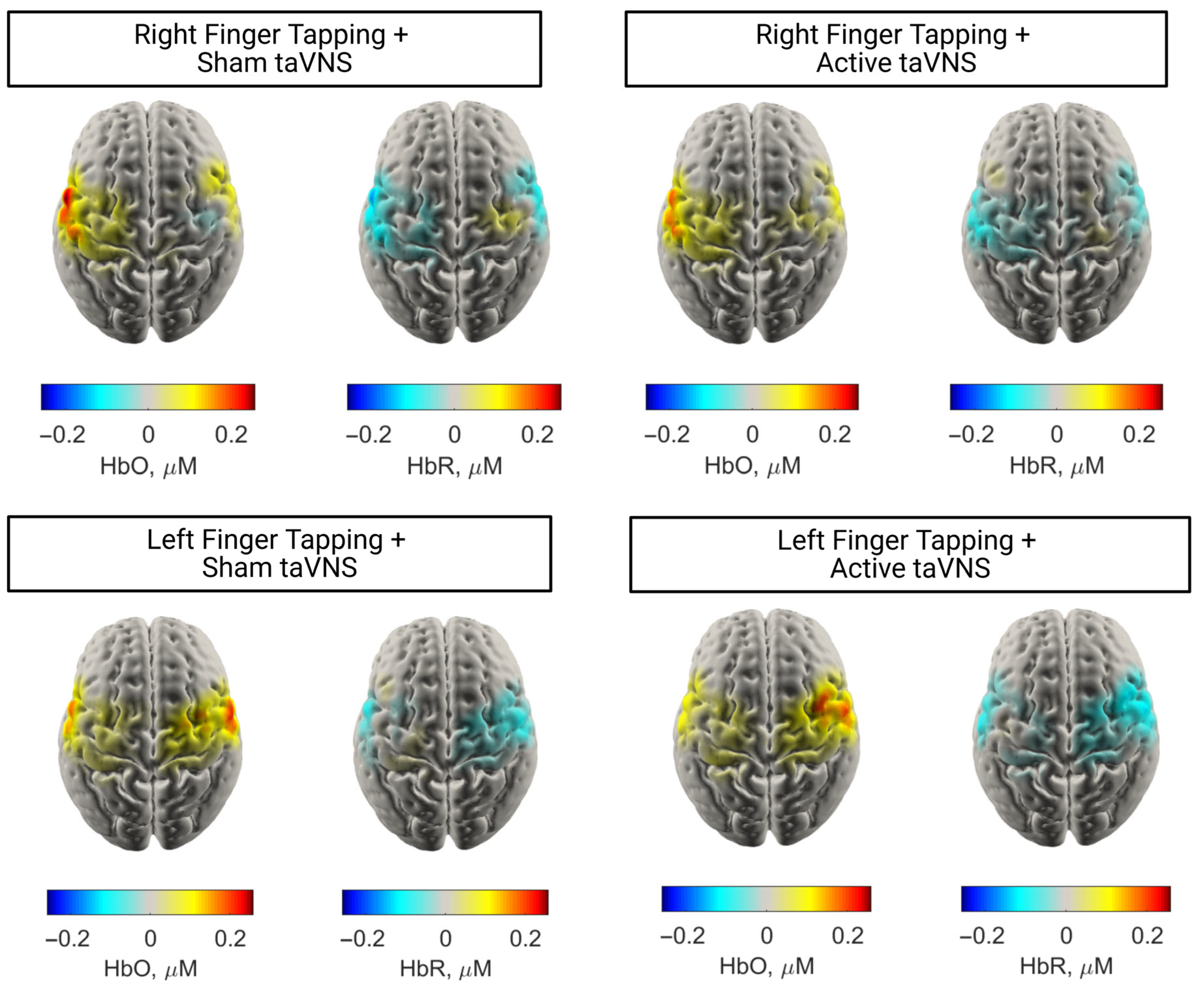 To visualise the cortical distribution of task-evoked responses, group-level HbO activation maps were generated for right-hand finger tapping execution under both sham and active taVNS conditions. These maps represent the average HbO and HbR concentrations during the task period, 10–20 s post-stimulus onset.