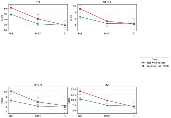 Changes in tinnitus distress (TFI), anxiety (GAD-7), depression (PHQ-9) and insomnia (ISI) pre-intervention (Pre), post-intervention (Post) and at follow-up (FU), comparing those not working less (blue lines) and those working less (due to tinnitus, retiring). Error bars represent 95% CIs.