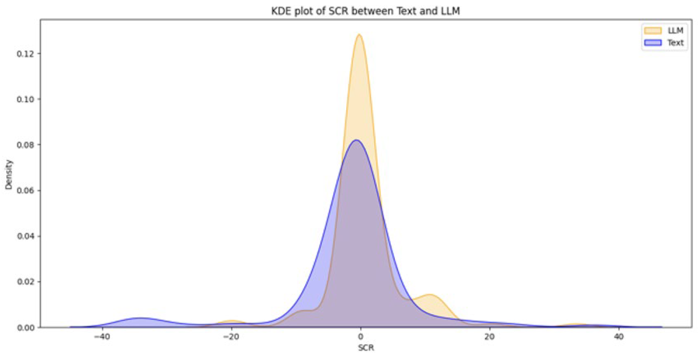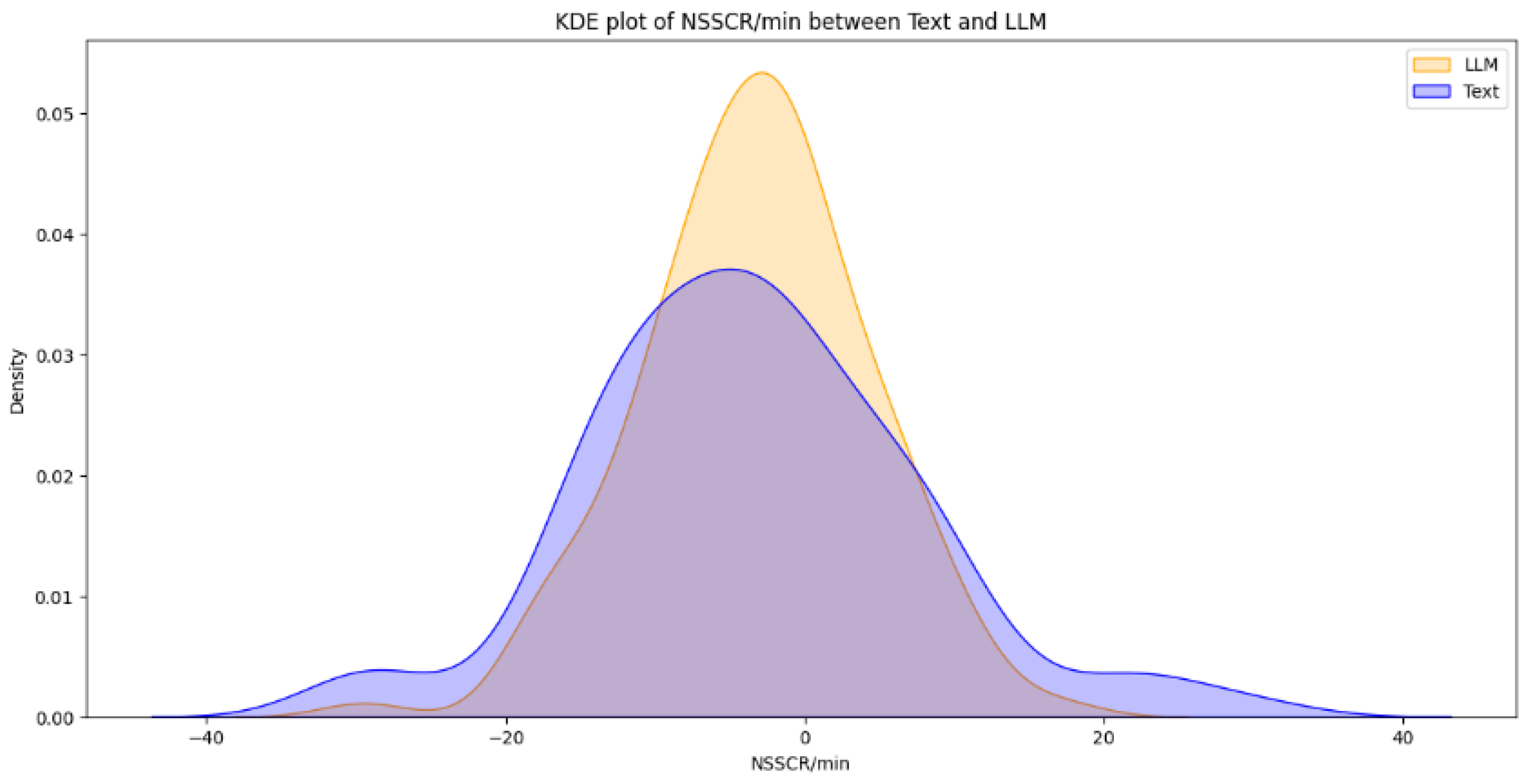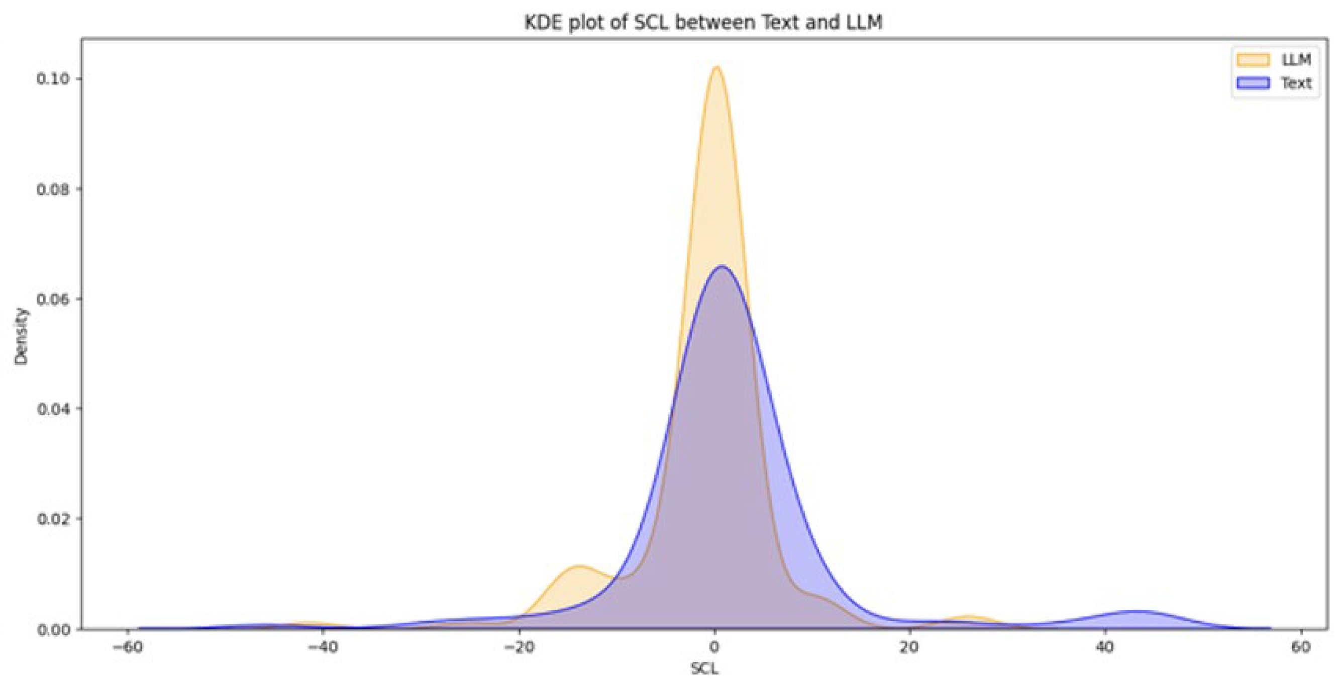 Figure 7 below present the respective Kernel Density Estimation plots for each of the five features under investigation, depicting learning from curated text versus learning from Large Language Models.