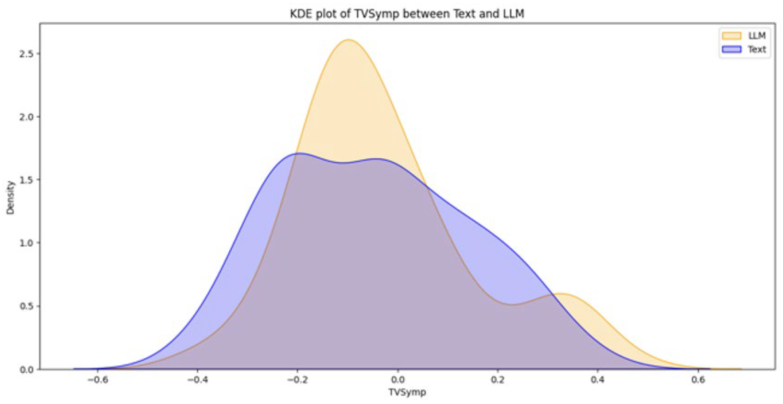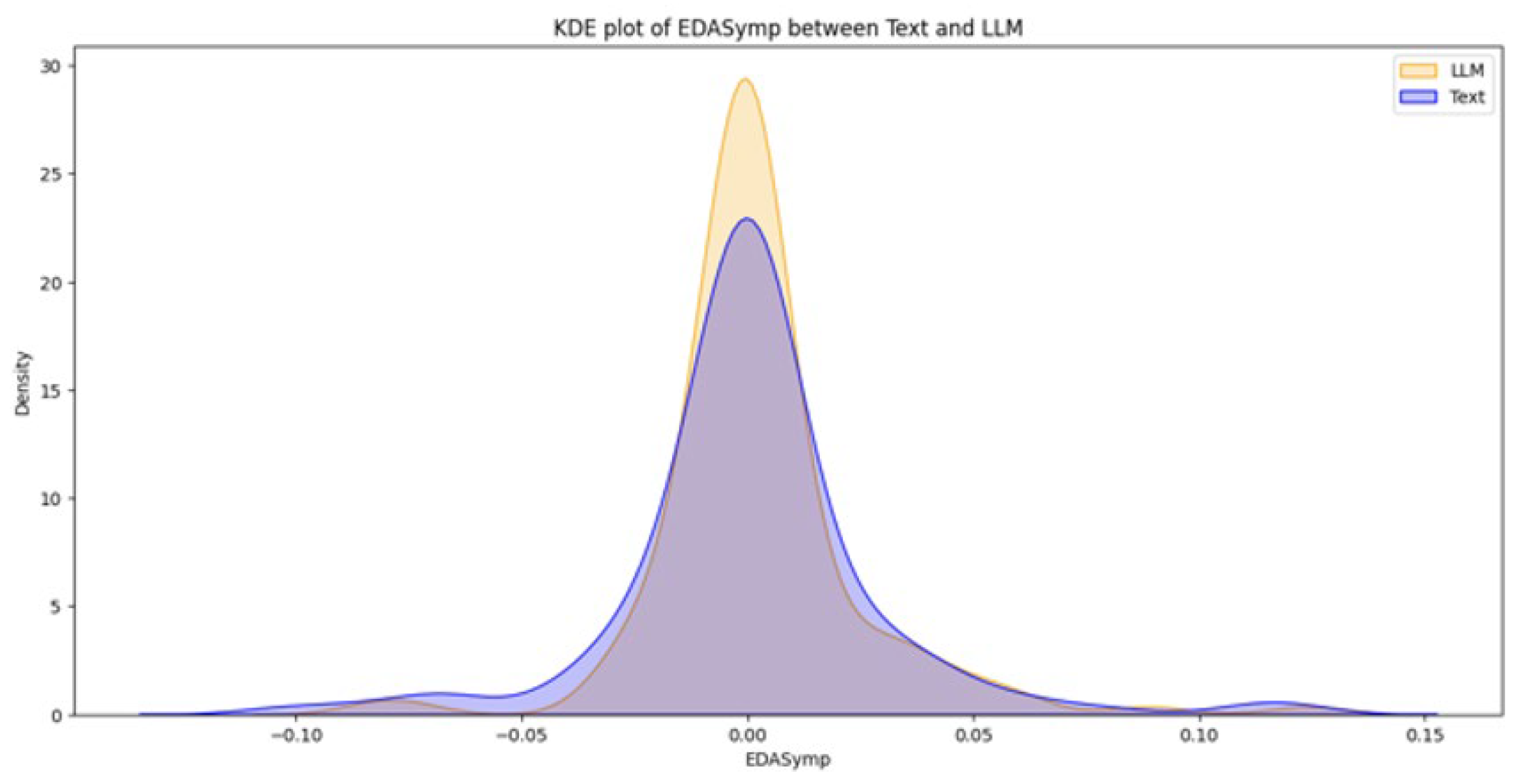 p-value = 0.09404). Conducting the same test on the rest of the features (NSSCR, TVSymp and EDASymp), the results showed no statistical difference between LLM and curated text, based on the level of significance of