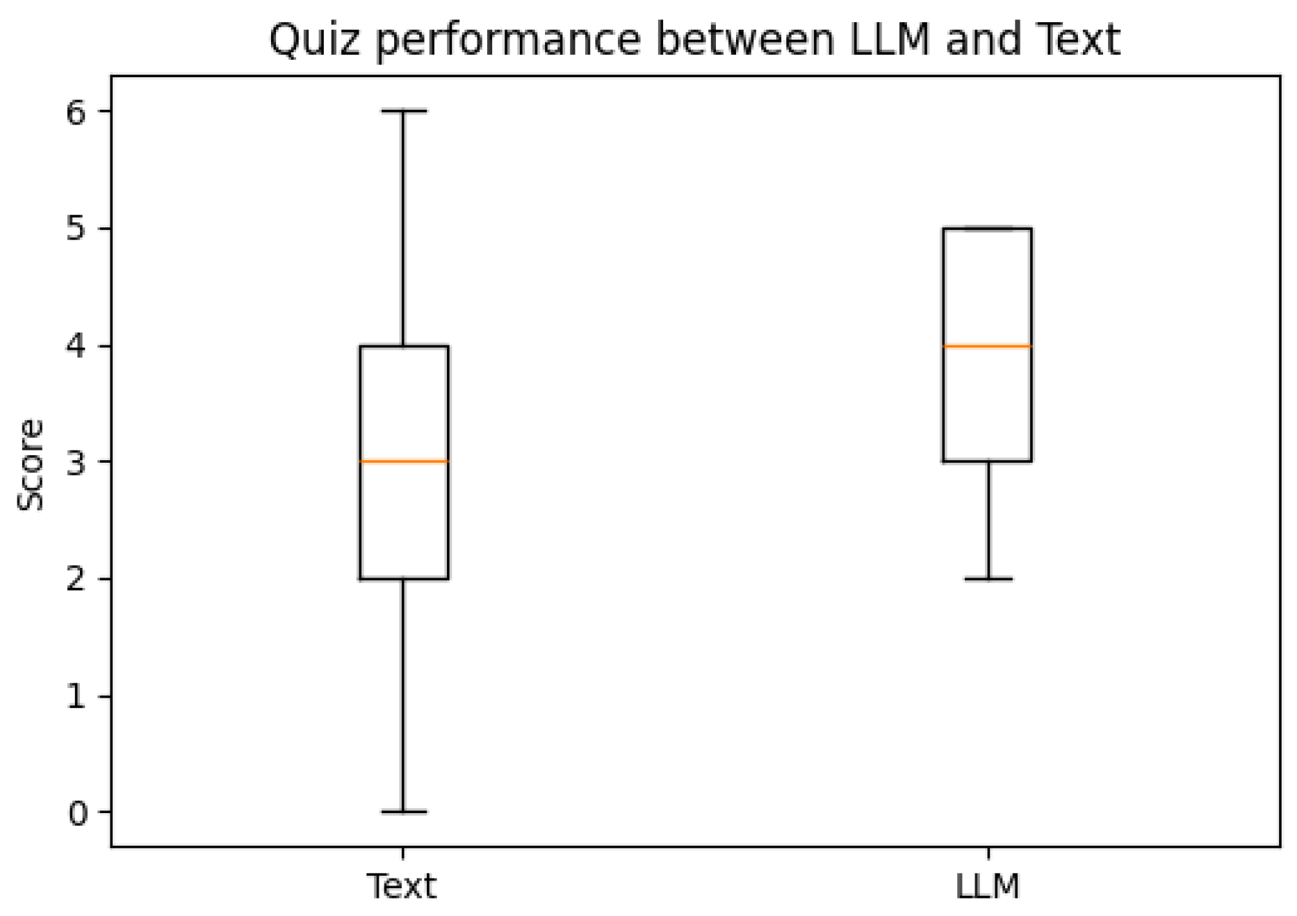 Interestingly, on average, it was found that quiz performance after learning via LLM was better than curated text, with LLM having a higher median and minimum score compared to curated text, as seen in