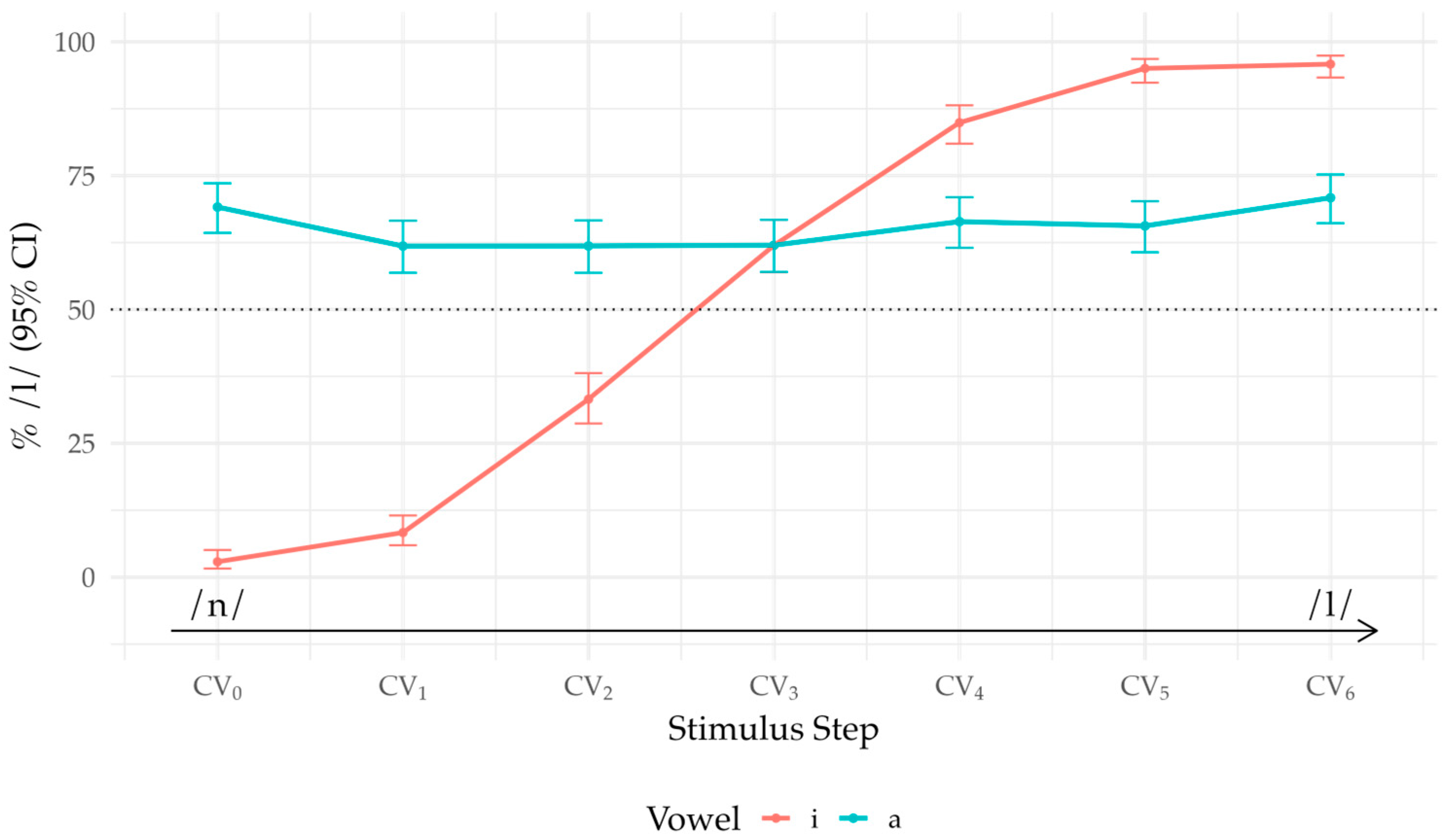Table 1 summarizes descriptive acoustic characteristics of the seven-step /n-l/ continua in the /i/ and /a/ vowel contexts. Consonant and vowel durations were held approximately constant across continuum steps within each vowel context, ensuring that temporal properties were not systematically manipulated along the continua. Vowel duration differed across vowel contexts, with longer vowels in the /a/ series than in the /i/ series.