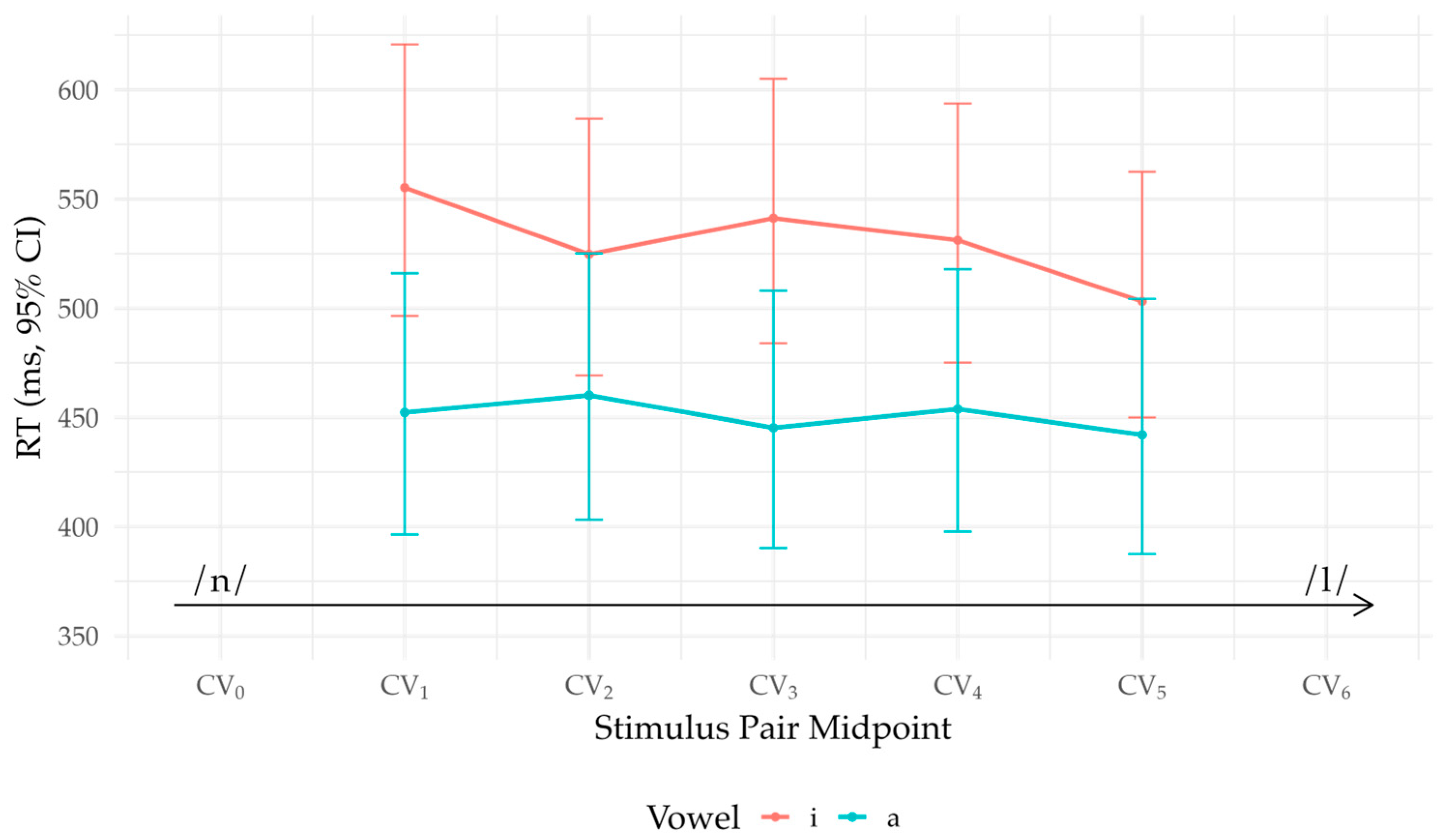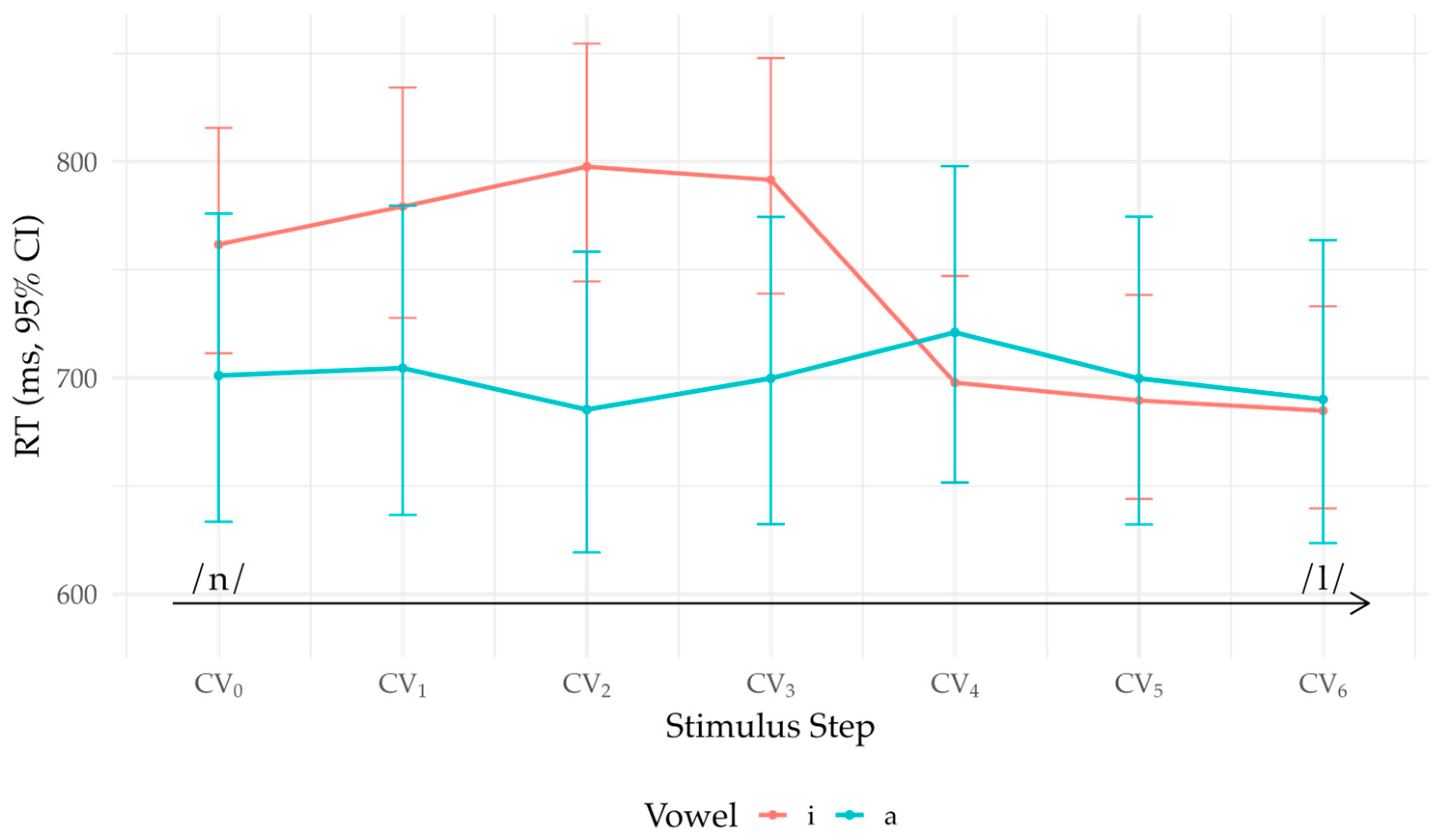 p > 0.05). Decomposition showed that the 5 → 4 transition was ~11.8% faster in /i/ (TR = 0.882) but ~3.0% slower in /a/ (TR = 1.030), indicating vowel-dependent behavior in the RT function near the /l/ end of the continuum. Between-vowel RT differences at individual steps were otherwise small and, after Holm adjustment, not systematically different from zero.