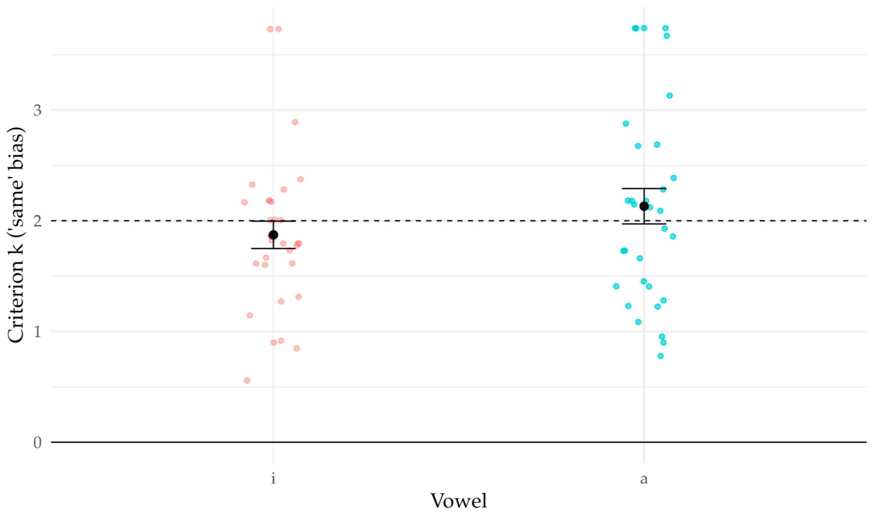 We estimated bias and sensitivity under the equal-variance differencing model appropriate for roving same–different AX (see Methods). For each Subject × Vowel, we anchored the criterion k from the false-alarm rate at Δ = 0 (“same pairs”, noise) and solved d′ at Δ = 2 (two-step “different” pairs) from the hit rate (signals).