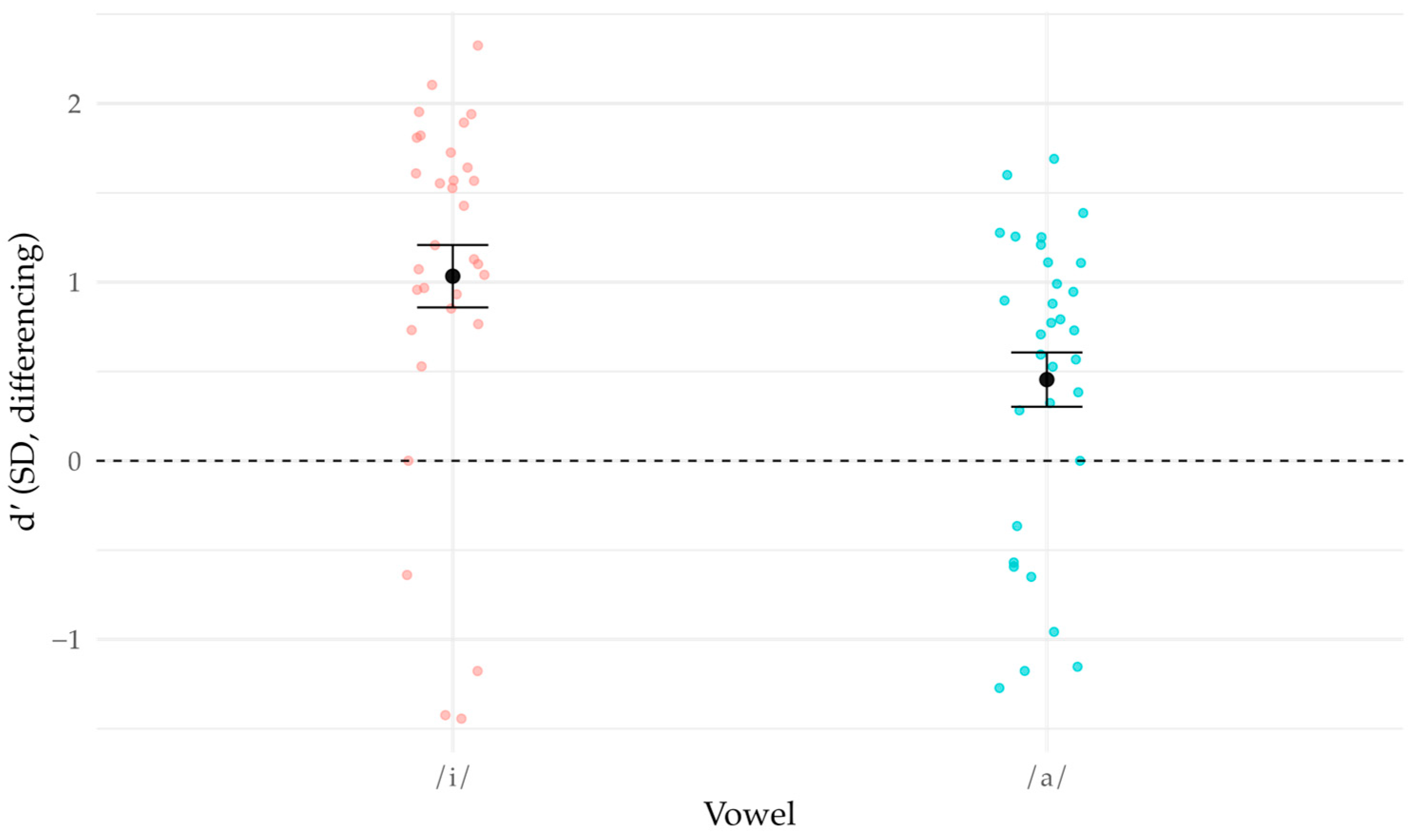 We analyzed AX discrimination at Δ = 2 (unordered 2-step pairs) in two vowel contexts (/i/, /a/), using trial-level accuracy as the dependent variable (1 = correct “different”, 0 = incorrect). After preprocessing and restricting to “different” trials only, 3748 trials entered the analysis.