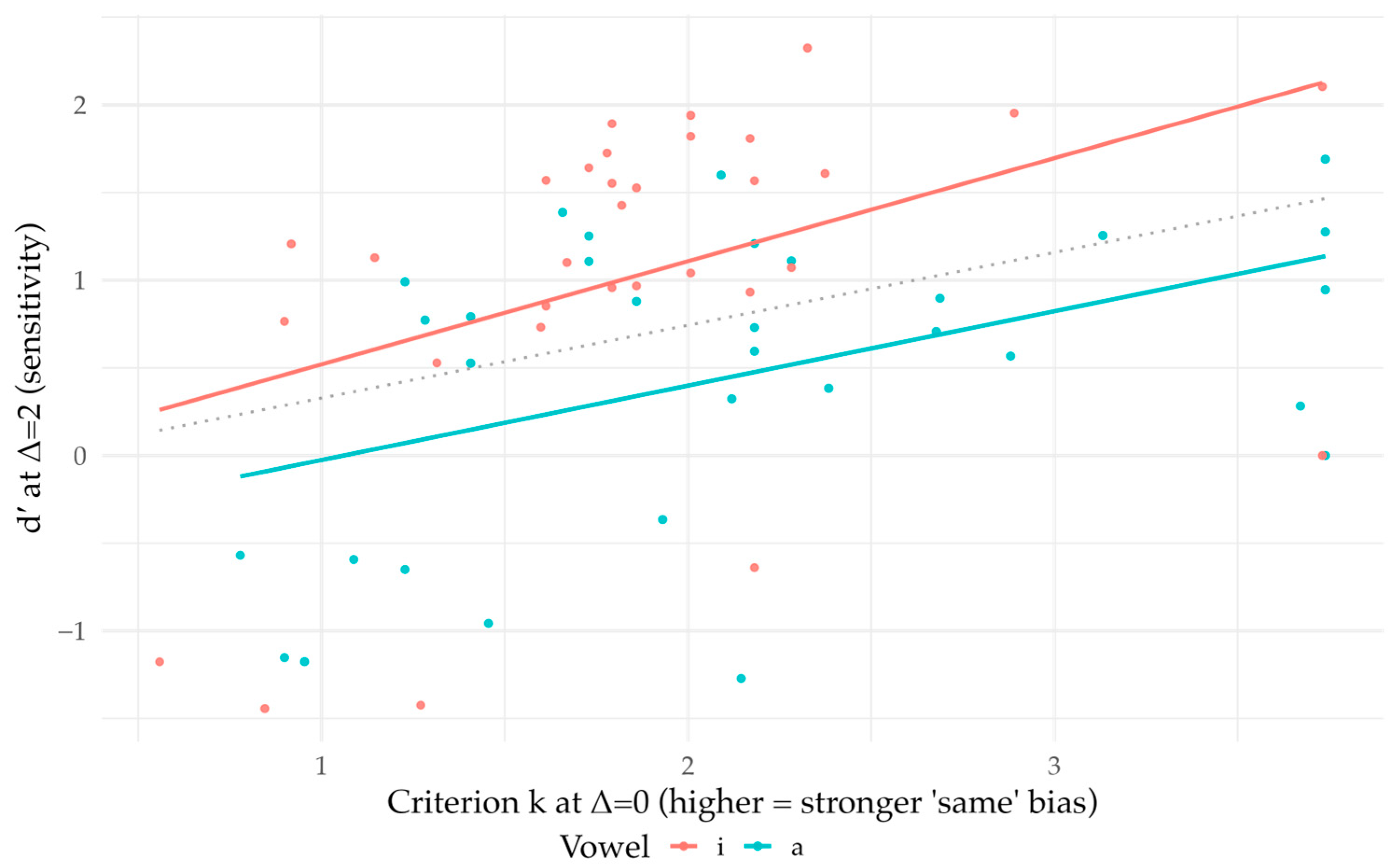 Signal detection analyses further revealed substantial individual variability. Listeners exhibited a strong same-response bias in both vowel contexts, and the positive association between sensitivity and bias across listeners suggests stable individual differences in perceptual clarity rather than a simple speed–accuracy trade-off. These differences likely reflect variation in how reliably listeners extract and integrate contrast-relevant cues from the acoustic signal, without altering the overall vowel-dependent pattern observed at the group level.