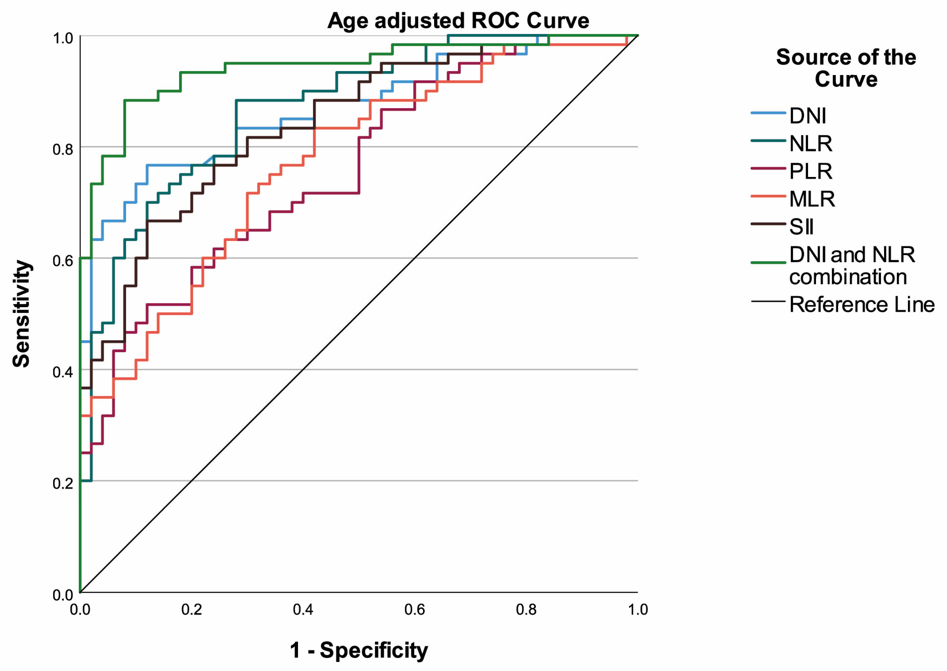 To address the potential confounding effect of age on diagnostic performance, age-adjusted ROC curve analyses were performed using propensity scores. After adjustment for age, both DNI and NLR maintained excellent discriminative ability, with AUC values of 0.870 (95% CI: 0.804–0.935) for both markers. The combined DNI-NLR model showed marginally improved performance after age adjustment, achieving an AUC of 0.943 (95% CI: 0.900–0.986) with a sensitivity of 88.3% and a specificity of 86.0%. These findings confirm that the diagnostic utility of DNI and NLR is not solely attributable to age-related differences between groups (Table 3, Figure 2).
