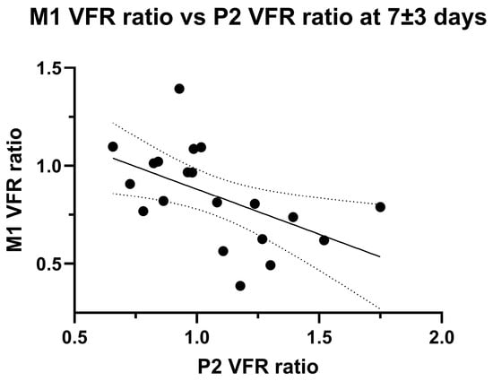 Linear negative correlation between M1 VFR ratio and P2 VFR ratio in late (7 ± 3 days) measurements. Note that two outliers were excluded (>third quartile + 1.5 × inter-quartile range, p = 0.07 with outlier inclusion).