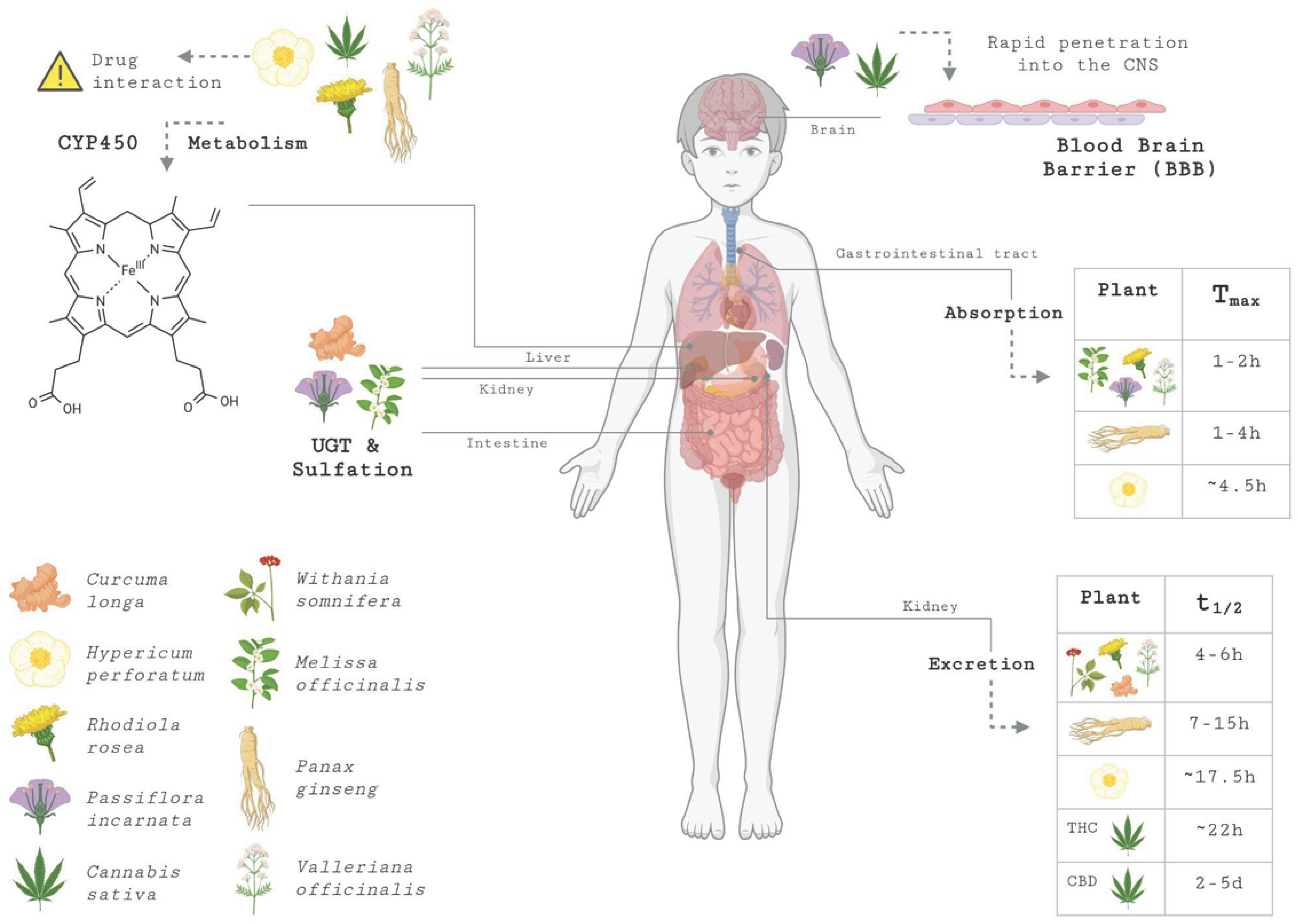| Hypericum perforatum | Hypericin/Hyperforin | Human | 8–15 ng/mL | 4.5 h | 17.5 h | [118] |