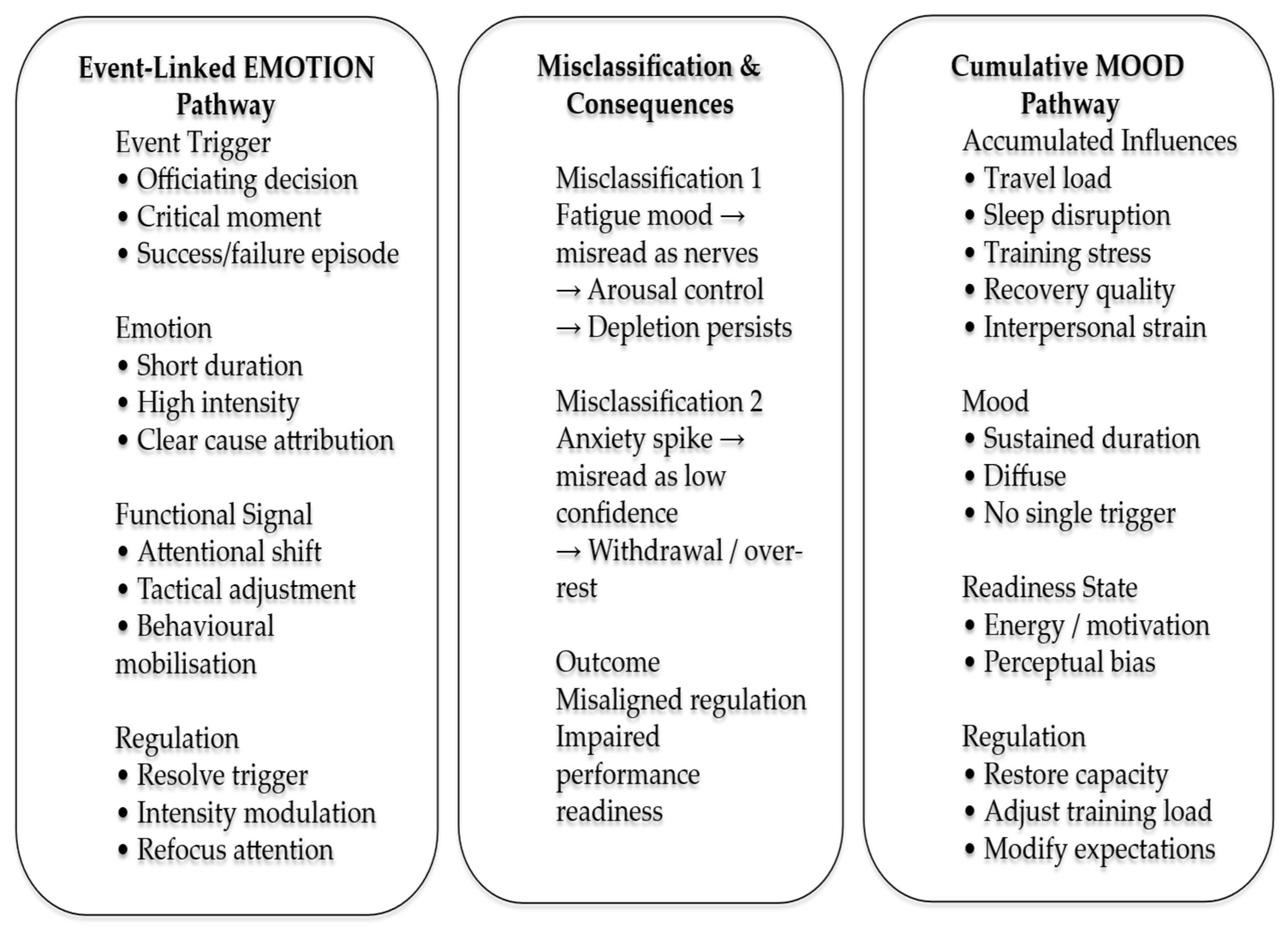 4]. Conversely, a brief surge of anxiety immediately before performance may be interpreted as a generalized loss of confidence or readiness, leading to unnecessary rest, withdrawal, or overly conservative pacing strategies that are disproportionate to the situational demand. In both cases, performance readiness is compromised because the regulatory response does not align with the source, duration, or functional meaning of the affective signal. These examples illustrate why accurate distinction between mood and emotion is essential for selecting regulation strategies that protect both immediate performance and longer-term sustainability.