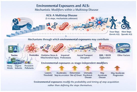 Amyotrophic lateral sclerosis (ALS) is conceptualized as a multistep disease requiring the accumulation of approximately five to six pathogenic events (“hits”), the precise biological nature and order of which remain unknown. Individuals with high-penetrance genetic variants require fewer steps to reach clinical disease, whereas sporadic ALS requires the accumulation of more steps over time. Environmental exposures—including trauma, pesticides, heavy metals, organic solvents, persistent organic pollutants, air pollution, micro- and nanoplastics and others (the ALS exposome), do not define these steps but influence disease risk through multiple convergent biological mechanisms. Shown are key mechanisms implicated in ALS pathogenesis that may be modified by environmental exposures, including neuroinflammatory priming, oxidative stress and mitochondrial injury, impaired proteostasis and protein handling, disruption of axonal transport, and dysfunction of the blood brain and blood spinal cord barriers. Acting as stage-independent modifiers, environmental exposures may lower the threshold for step acquisition, accelerate the accumulation of pathogenic steps, influence the anatomical site of disease onset, unmask preclinical disease, and potentially accelerate disease progression. This framework reconciles epidemiological and biological data by positioning environmental exposures as probabilistic modifiers of disease timing and expression rather than deterministic causes of ALS.