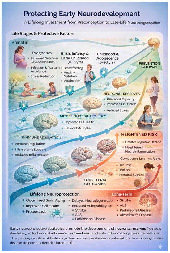 Pamphlett and Kullmann [46] evaluated early-life events and conditions as poly-environmental risk factors in the context of the multistep model of ALS, finding a small effect on those born and living longer in an area, having younger parents, and a lower educational attainment with fewer years of education. Exposure to adverse environmental factors during early life is step-inductive, negatively impacts neurodevelopment, and increases the risk of neurodegeneration, including ALS in later life. Steps acquired through early-life exposures may matter more than later life events, because they are associated with irreversible biological transitions. Even mild and subclinical insults during the gestational and perinatal periods are critical to neurodevelopment [91], laying the seeds for later-life neurodegeneration [92,93]. During gestation and the perinatal periods, key maturational processes, including neuronal proliferation, migration, myelination, synaptic pruning, and the finely tuned transport system essential for synapse maturation, are vulnerable to genetic, epigenetic, immune, and metabolic aberrations. Early-life microbiome dysbiosis increases blood–brain barrier permeability with potential for chronic inflammation [33]. Protecting neurodevelopment requires minimizing early biological stress, supporting nutrition and immune balance, and preserving neural resilience across the life course. Optimizing nutrition during fetal and early postnatal life is a golden opportunity to protect neurodevelopment and brain function across the lifespan [94] (see Figure 3).