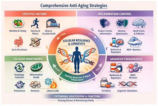 - Wei, Y.; Xiong, B.; Song, Z.; Zhong, S.; Zheng, N.; Zhang, A.; Chen, Y.; Sun, H. Aging and anti-aging strategies: A review of past and future therapeutics. Bioorg. Med. Chem. 2025, 129, 118340. [Google Scholar] [CrossRef]