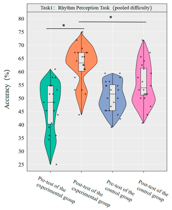 Comparison of the accuracy rates of the two groups of pooled-difficulty rhythm perception before and after tests. Note: * p < 0.0125.