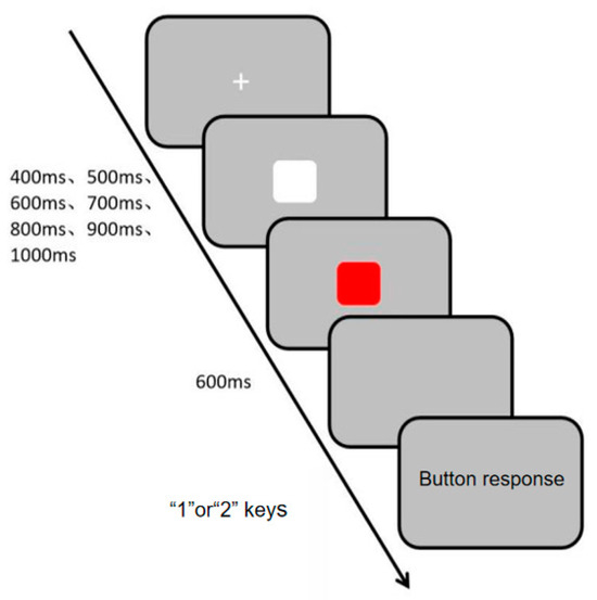 Visual channel rhythm perception was measured using the Visual Channel Rhythm Perception Task (Task 3), programmed and data collected with the E-prime 3.0 psychological experiment software. During the experiment, a white “+” fixation point appeared in the center of the screen, followed by white and red squares presented sequentially at random intervals of 400 ms, 500 ms, 600 ms, 700 ms, 800 ms, 900 ms, and 1000 ms. Participants were informed that the two squares would appear at different times but not the exact intervals. They were instructed to make their judgment after the second square disappeared, ensuring that the response was based on a completed perceptual evaluation rather than a speeded reaction to an ongoing stimulus. This design emphasizes accuracy in temporal discrimination over simple reaction speed. They were instructed to press the “1” or “2” key to determine if the squares appeared at the same time (press “1” for consistency, “2” for inconsistency). The specific experimental procedure is shown in Figure 5. The experiment consisted of 10 practice trials and 30 main trials. Evaluation metrics included accuracy rate and reaction time, with higher accuracy and shorter reaction time indicating stronger visual channel rhythm perception ability.
