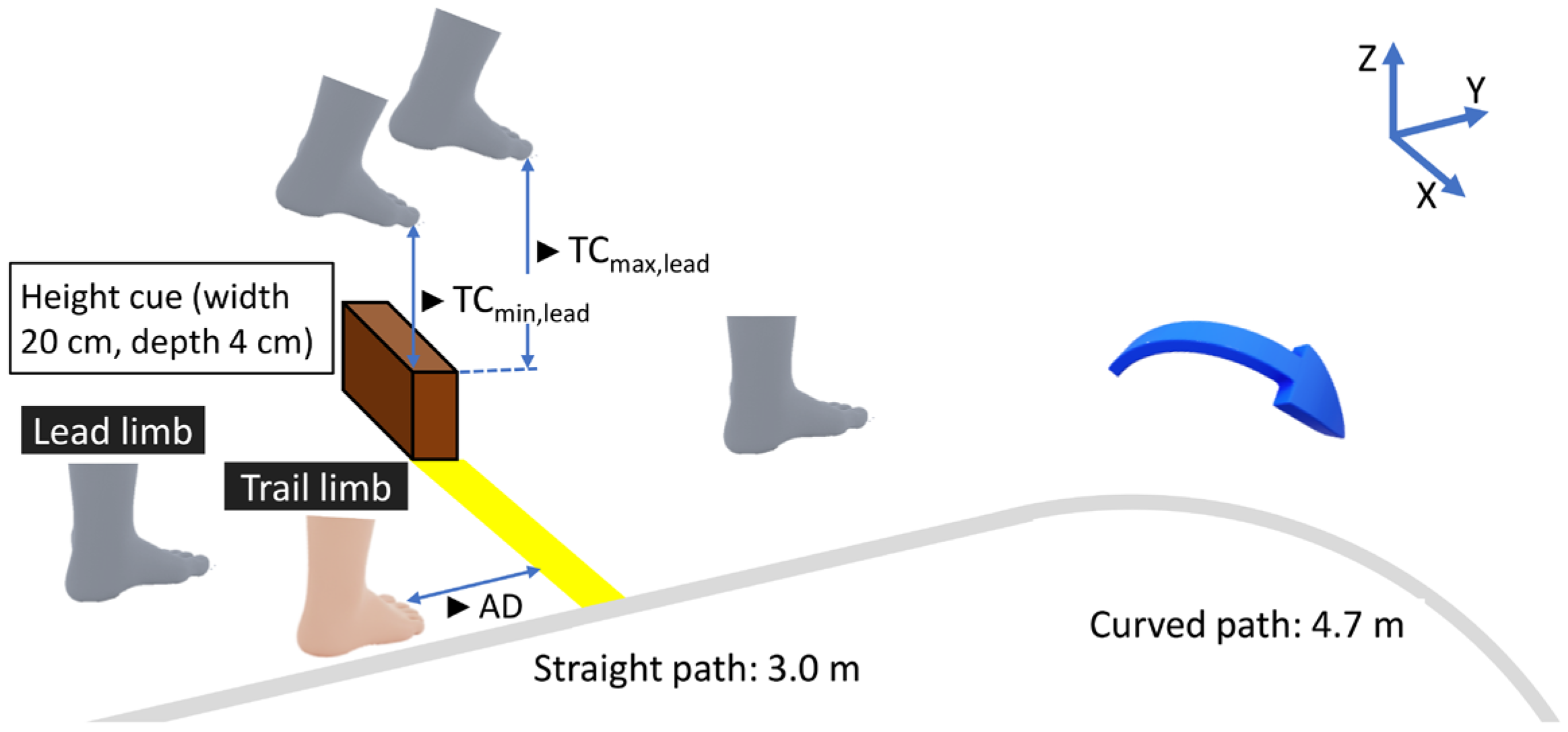 To address these challenges, we investigated a simplified simulated obstacle crossing paradigm that utilized visual height cues placed adjacent to the walking path, rather than physical obstacles at the crossing location. In this paradigm, the obstacle height was specified using three-dimensional objects, whereas the crossing location itself was marked on the floor. This approach is easy to implement, allows immediate adjustment of obstacle parameters, and ensures safety by eliminating collision risks. Importantly, the design intentionally dissociates height specification from physical contact, reflecting a simplified but visually explicit form of obstacle representation that is conceptually consistent with prior virtual reality-based gait training research. By arranging these cues within continuous walking circuits that incorporate both straight and curved segments, the paradigm enables continuous repetitive practice, thereby securing the training volume required for motor learning. Accordingly, this paradigm was first examined in healthy young adults to characterize the fundamental motor control responses elicited by simulated obstacle crossing. To assess the validity of this approach, we focused on toe clearance (TC) because its variability is a well-established indicator of tripping risk during level walking [