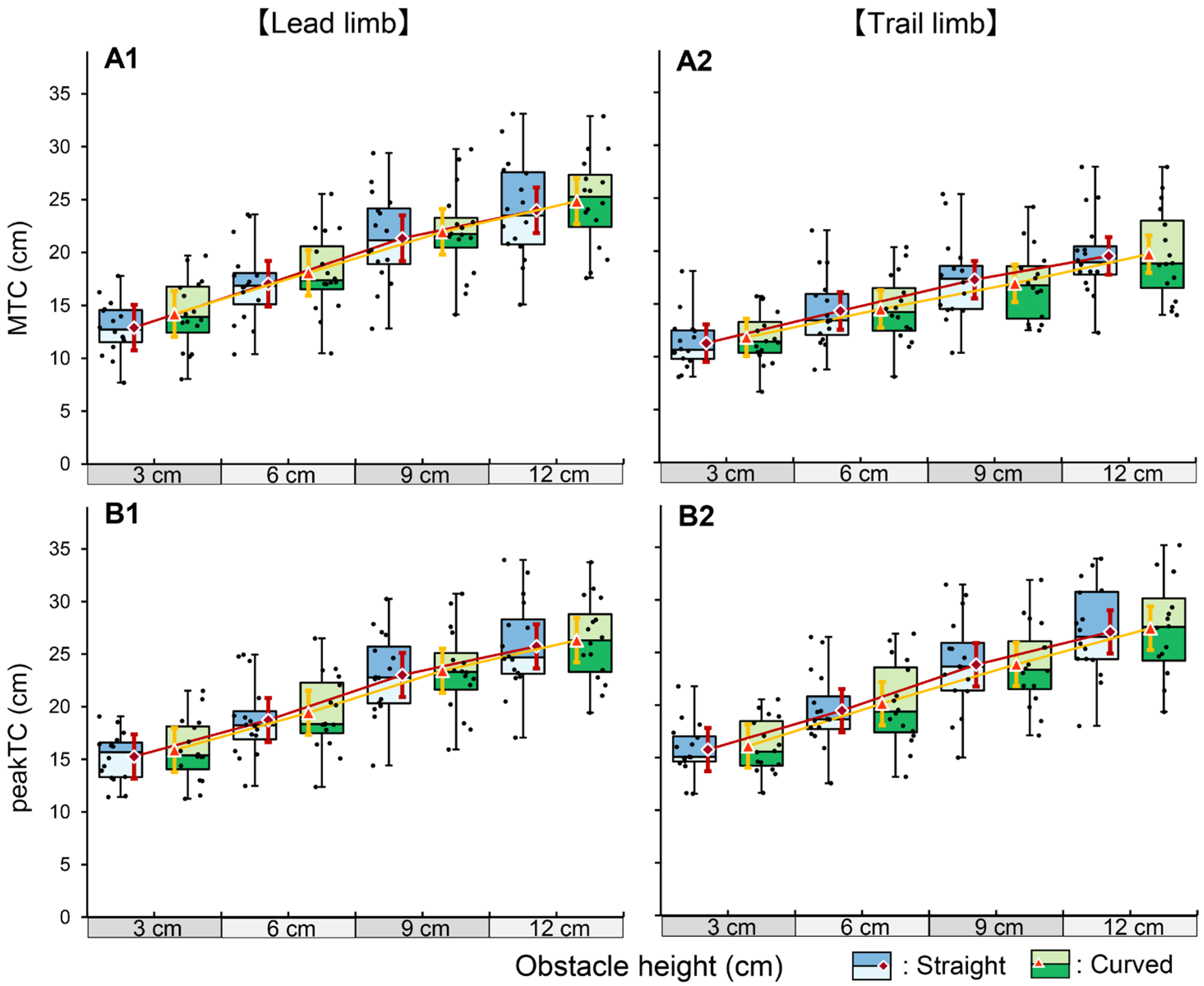 Regarding the effect of the walking path, adaptive strategies differed between the limbs. For the lead limb, the MTC was significantly increased on the curved path compared to the straight path, with no significant interaction between obstacle height and course. To the best of our knowledge, kinematic adjustments of toe clearance during obstacle crossing on curved paths have not been comprehensively documented in the literature. However, curved walking is known to impose increased motor demands and instability compared to straight walking, often necessitating reduced gait speed [