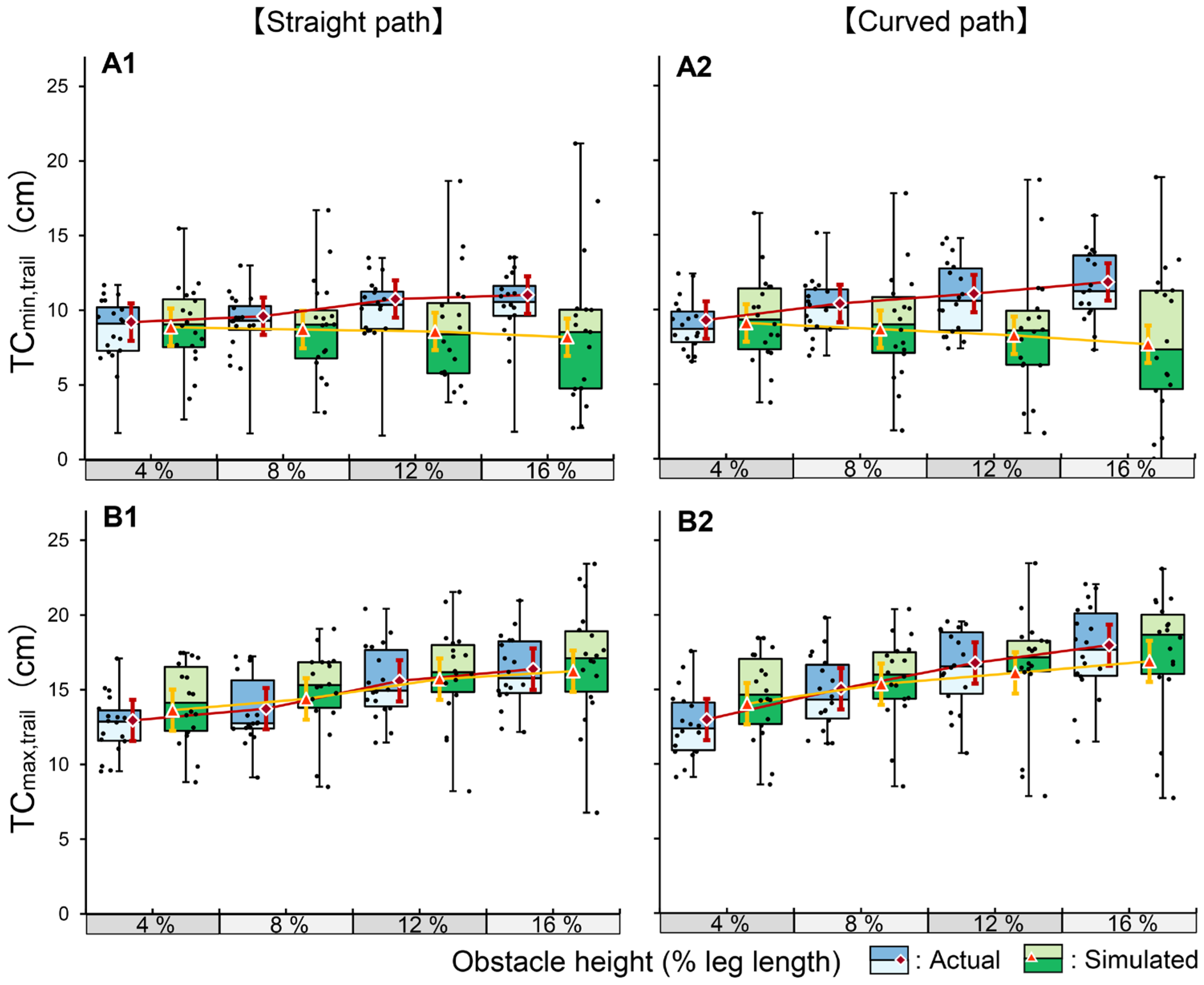 min,trail in the actual condition increased linearly with the obstacle height, reflecting a conservative safety strategy. This linear expansion is particularly striking when compared with previous reports of constant trail clearance [