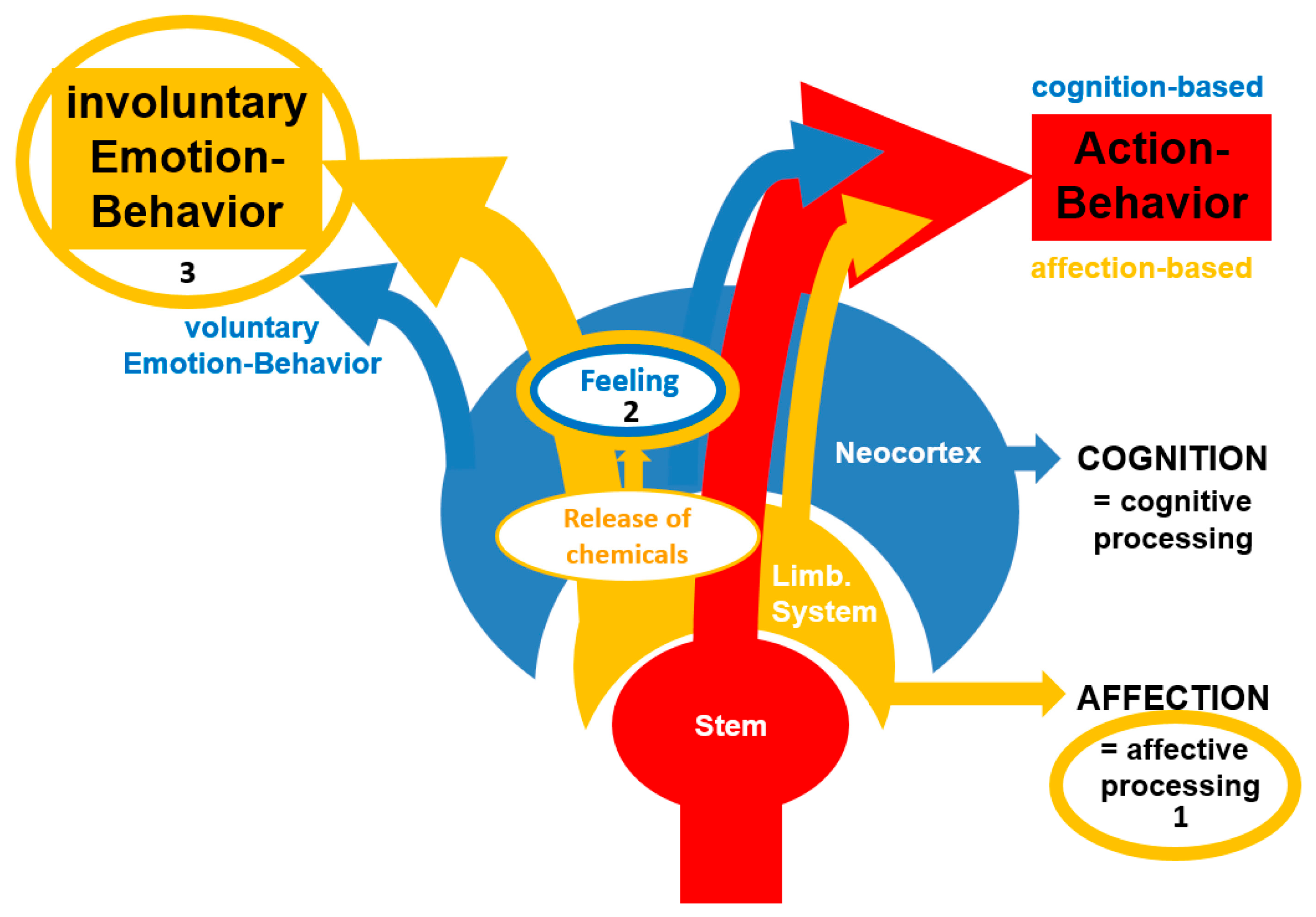 In the context of the already mentioned masking problem, this model allows for the existence of both involuntary and voluntary emotions. While some expressions are produced automatically as a result of above-threshold affective processing (e.g., a genuine scream of terror), humans have also developed the cortical (cognitive) capacity to produce voluntary emotions to feign a state that they do not actually feel. This is common in social “masking” or strategic emotional management, where individuals display a “happy face” to maintain social harmony despite feeling internal distress. The figure below (