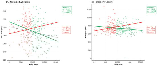 Linear regression analysis between daily steps and executive function. (A) Higher daily steps predicted faster sustained attention (PVT-B RT) in the total sample (r = −0.173, p = 0.002), driven by the High_PA group (p = 0.014). (B) For inhibitory control (Stroop RT), a significant positive association emerged only in the Low_PA group (r = 0.181, p = 0.027). Dashed line = total sample; solid lines = group-specific regressions. High_PA ≥ 9650 steps/day; Low_PA < 9650 steps/day. Regression statistics (β0, β1, r) are displayed within each panel. Note: β0 = intercept; β1 = slope; * p < 0.05.