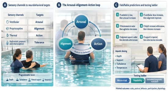 In closing, the framework is intended less as a claim about a unique modality and more as a way to make early aquatic rehabilitation conceptually explicit, clinically reportable, and empirically testable. This perspective treats aquatic therapy as a programmable multisensory medium for early sABI rehabilitation, where environmental levers can be dosed to stabilize arousal regulation, support postural alignment, and elicit task-oriented action while reducing the penalty of postural error. The Arousal–Alignment–Action loop frames these variables as coupled, measurable, and falsifiable rather than anecdotal. With explicit boundary conditions, minimal confounder capture, and a feasible outcome battery, routine sessions can already be described and reported with greater precision, allowing aquatic therapy to function clinically as a structured organizing scaffold in appropriately screened patients. Micro-trials can quantify the immediate signal, followed by feasibility studies and pragmatic evaluations embedded in standard pathways. However, the mechanistic linkages and predictive claims proposed here remain hypothesis-generating until supported by stronger direct empirical evidence in sABI. If workable in this population, the same parameterized logic may also inform other controlled rehabilitation environments designed to engineer participation when conventional therapy cannot yet scale.