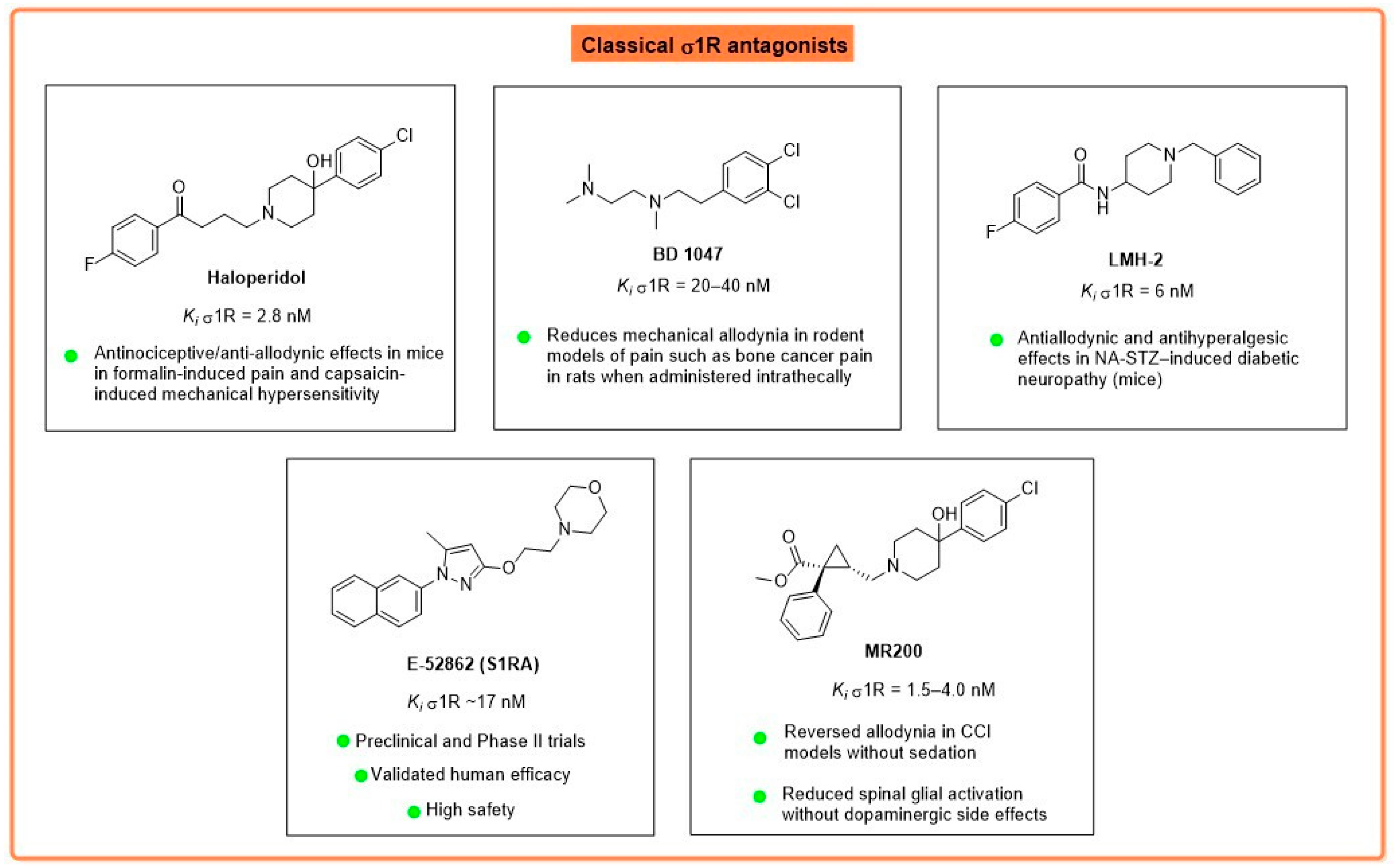 | Haloperidol | Butyrophenone | σ1R = 2–6 nM | Non-selective; high affinity for dopamine D2 receptors | Reduces mechanical allodynia/hyperalgesia in CCI and STZ-DPN models; limited by extrapyramidal side effects |