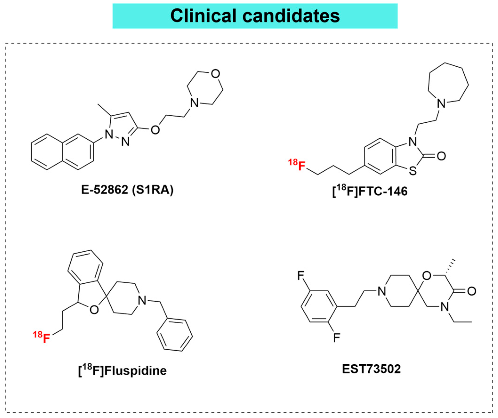 - Mastropasqua, F.; Ludwig, F.A.; Abate, C. A Full-Spectrum Evaluation of Sigma-1 Receptor (S1R) Positron Emission Tomography (PET) Radioligands from Binding Affinity to Clinical Imaging. Molecules 2025, 30, 4296. [Google Scholar] [CrossRef] [PubMed]