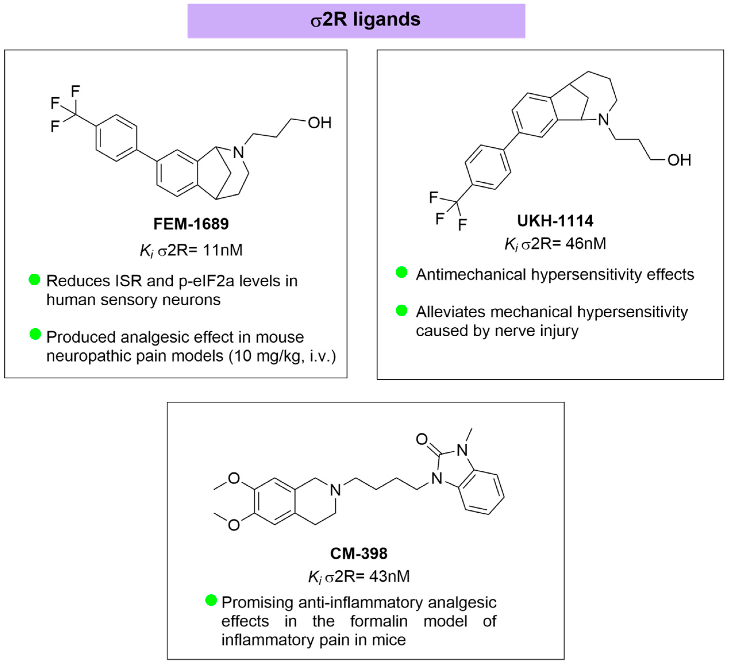 - FEM-1689 is the most extensively characterized σ2R/TMEM97 ligand (Ki = 11 nM) and provides definitive evidence of σ2R/TMEM97-dependent analgesia. Its efficacy is abolished in σ2R/TMEM97-knockout mice, establishing strict receptor dependence. FEM-1689 acts as a σ2R/TMEM97-dependent ISR suppressor, reducing p-eIF2α and ATF4 in DRG neurons and reversing SNI-induced mechanical allodynia [102].
