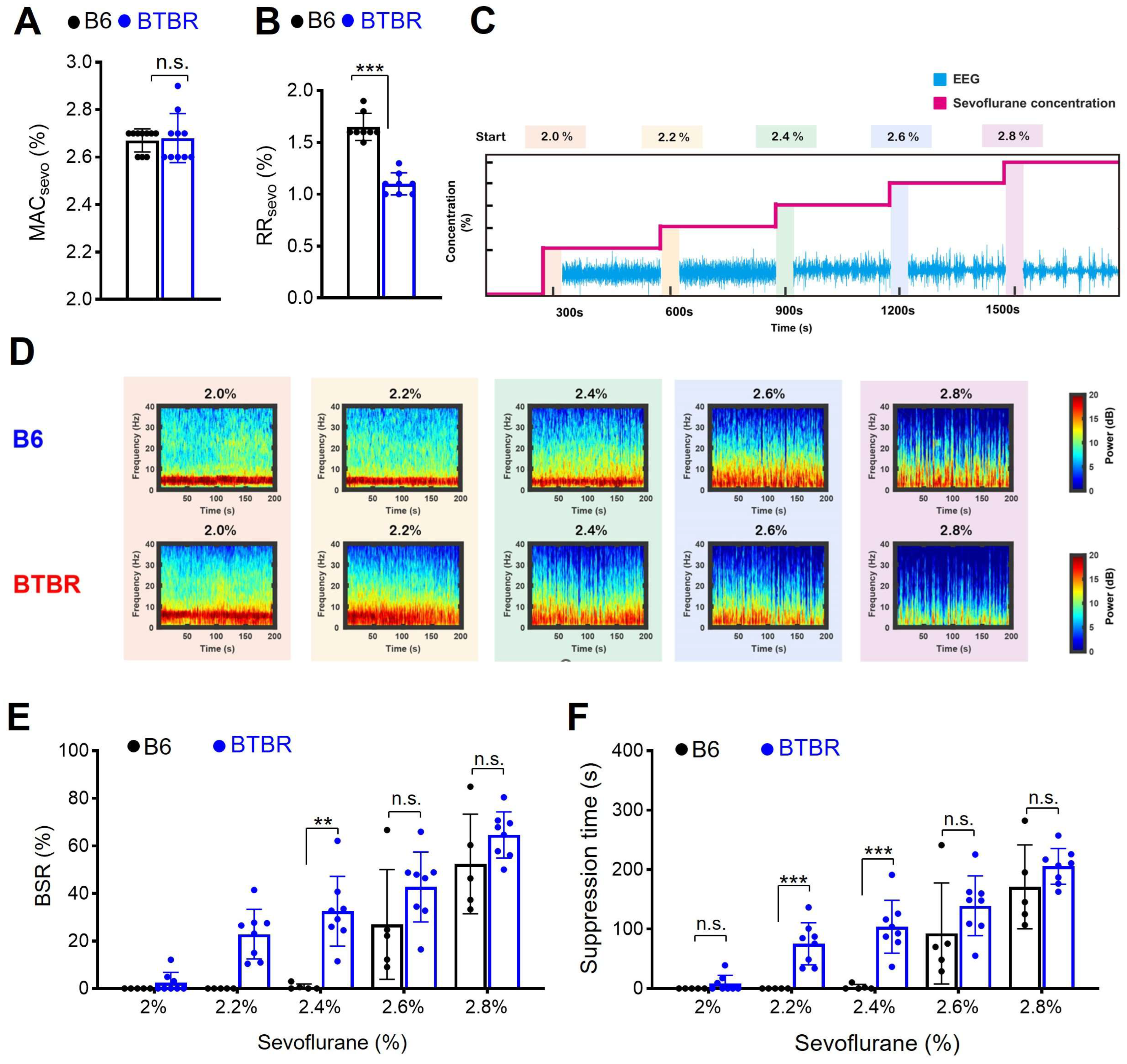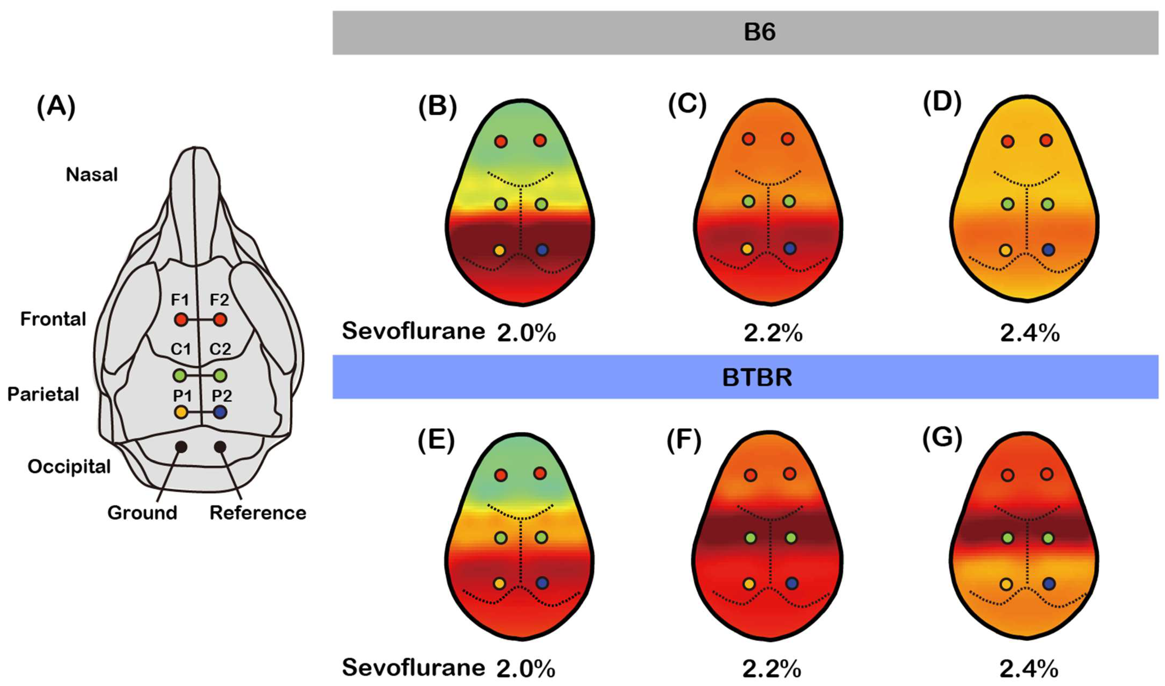 3.2. Sevoflurane-Induced Burst Suppression Appears at a Lower Sevoflurane Concentration in BTBR Mice
