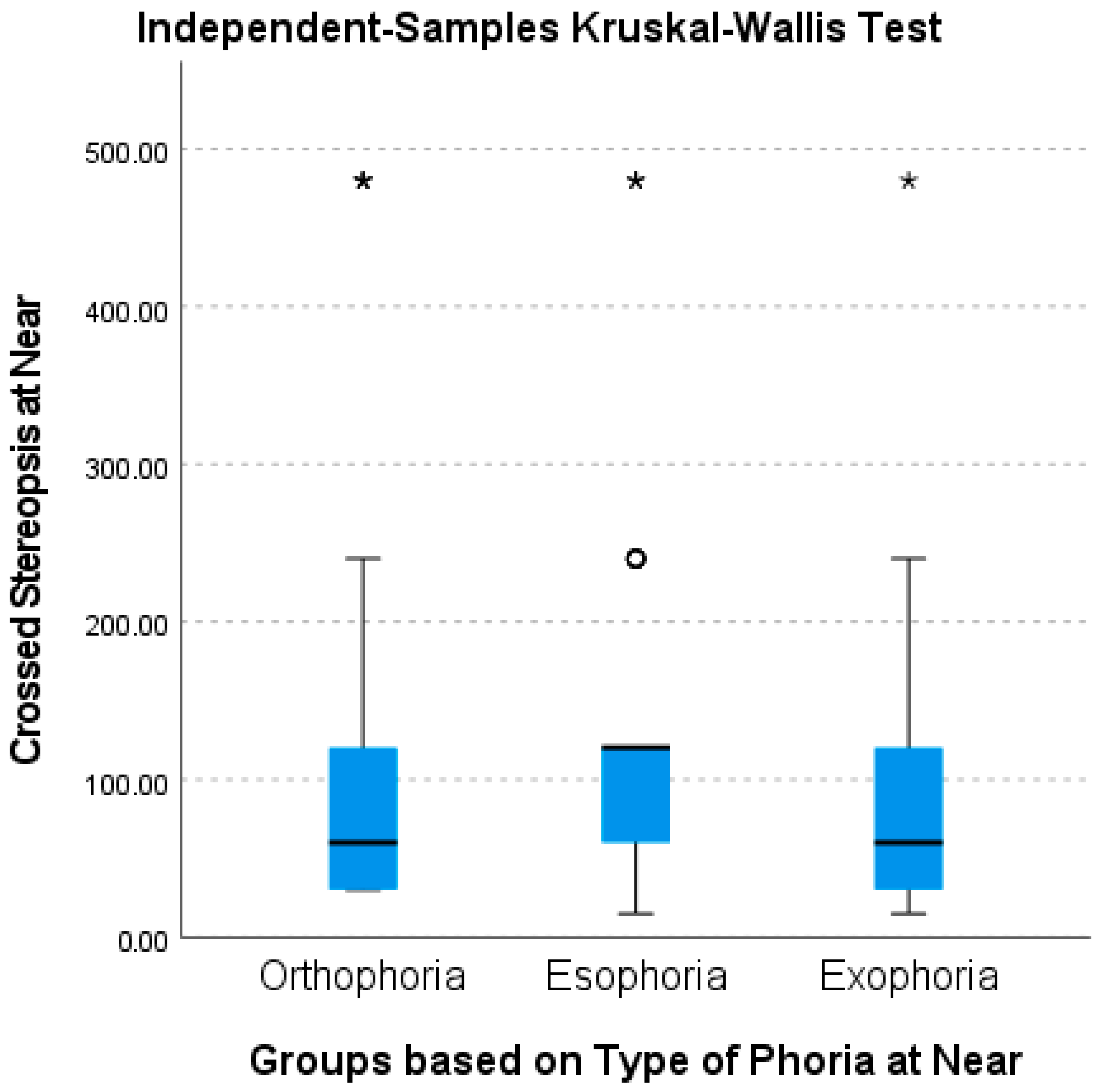 | X Stereopsis N | Ortho N, (N = 46) | 60 | 6.875, 2 * | Eso vs. Ortho = 14.085 * Eso vs. Exo = 17.77 * |
