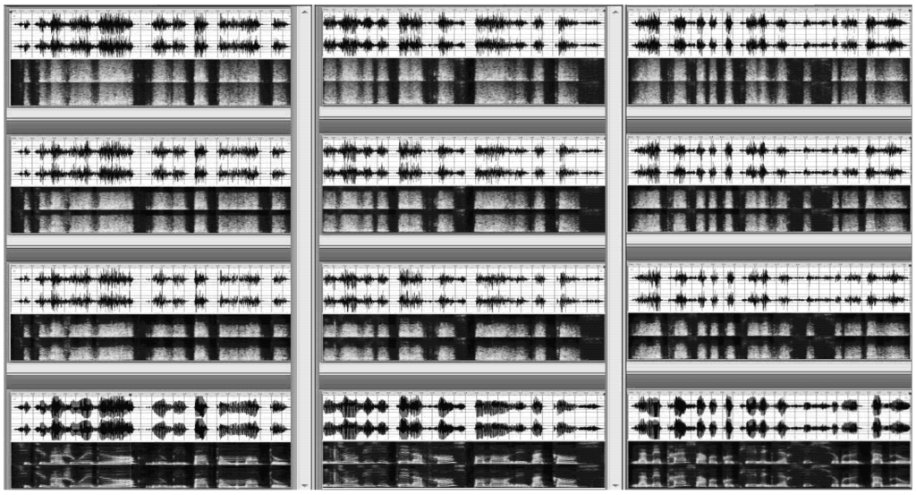 Waveforms and spectrograms of three sentences on the left (Si tu vas jouer dehors, n’oublie pas ton manteau.), middle (Ils ont visité la France pendant les vacances.), and right panel (La maîtresse a recopié l’exercice sur le tableau.) in the four degradation conditions. The bottom panel shows the no degradation condition (DL0), the second panel from the bottom shows the “low” degradation condition (DL1), the second panel from the top shows the “medium” degradation condition (DL2), and the top panel shows the “strong” degradation condition (DL3). Waveforms vertical scale range from 0 to −∞ (Unit: dB). Spectrogram vertical scale range from 0 kHz to 5 kHz (linear scale). Waveform and spectrogram horizontal time axis range from 0 s to the sentence duration, i.e., 2.08 s for the left panel, 2.57 s for the middle panel, and 2.70 s for the right panel.