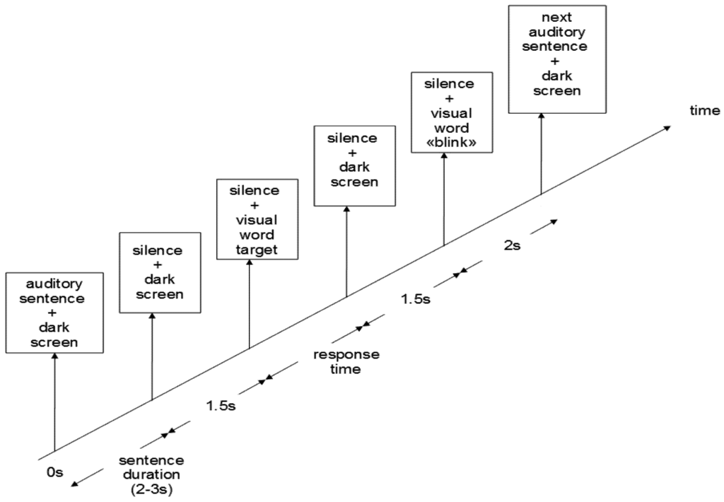 Participants were told to listen carefully to the auditory sentences and to perform a recognition task on the final word of the sentence. The forced-choice recognition task was based on Deacon et al. [62]. Participants were to press the left or right mouse button depending on whether the visual word (presented after the auditory sentence) was identical (“repeated” word) or not (“new” word) to the target word (the final word of the auditory sentence). The association between hand side (left or right) and response (“repeated” or “new” word) was balanced across participants. Participants were instructed to respond as fast and as accurately as possible, and to only guess if necessary. After the mouse button was pressed, and after 1.5 s, the word “blink” was presented visually. Participants were instructed that they could blink during this presentation and should avoid blinking at other times [12]. The message stayed on the screen for 1.5 s and was followed by a dark screen lasting for 2 s. A new auditory sentence was then presented (Figure 2).