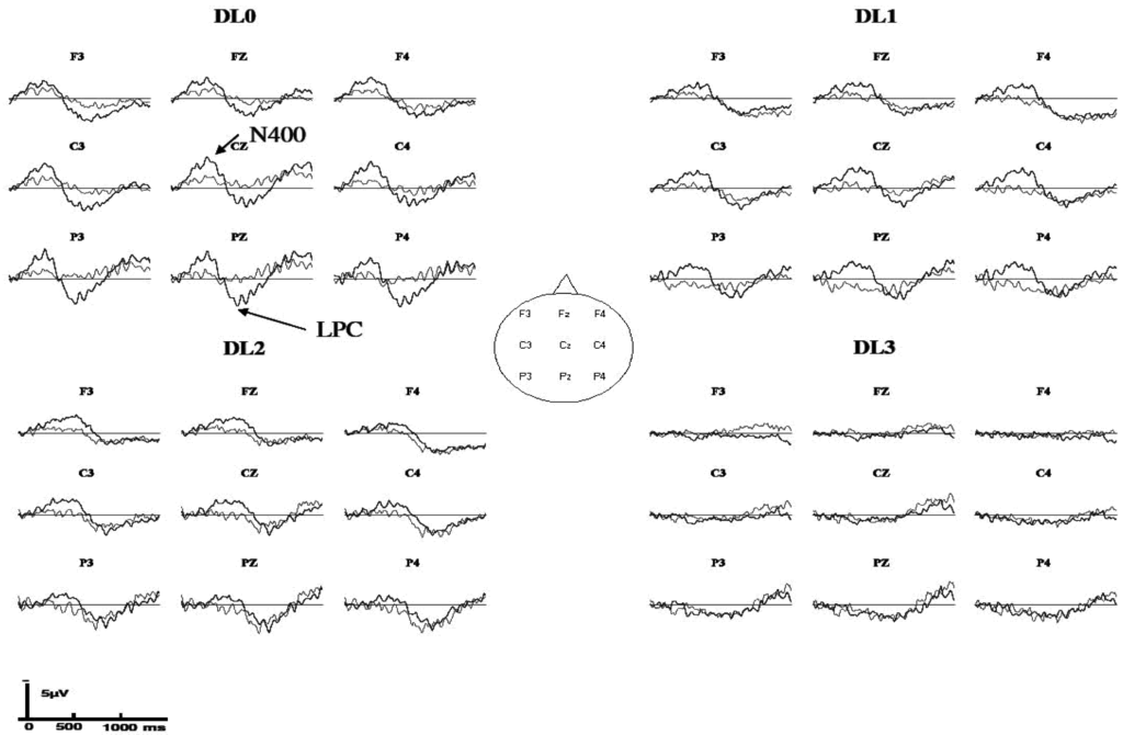 - The ERP effects found in the present study were closely replicated in a sleep research study wherein control data were recorded at wake. Indeed, a N400 effect was found at DL0 and DL1 but no N400 effect was recorded at DL3 (DL2 was not tested) using a similar material and a within-participants mixed (instead of block) design with a group of participants that were not included in the present study [86].