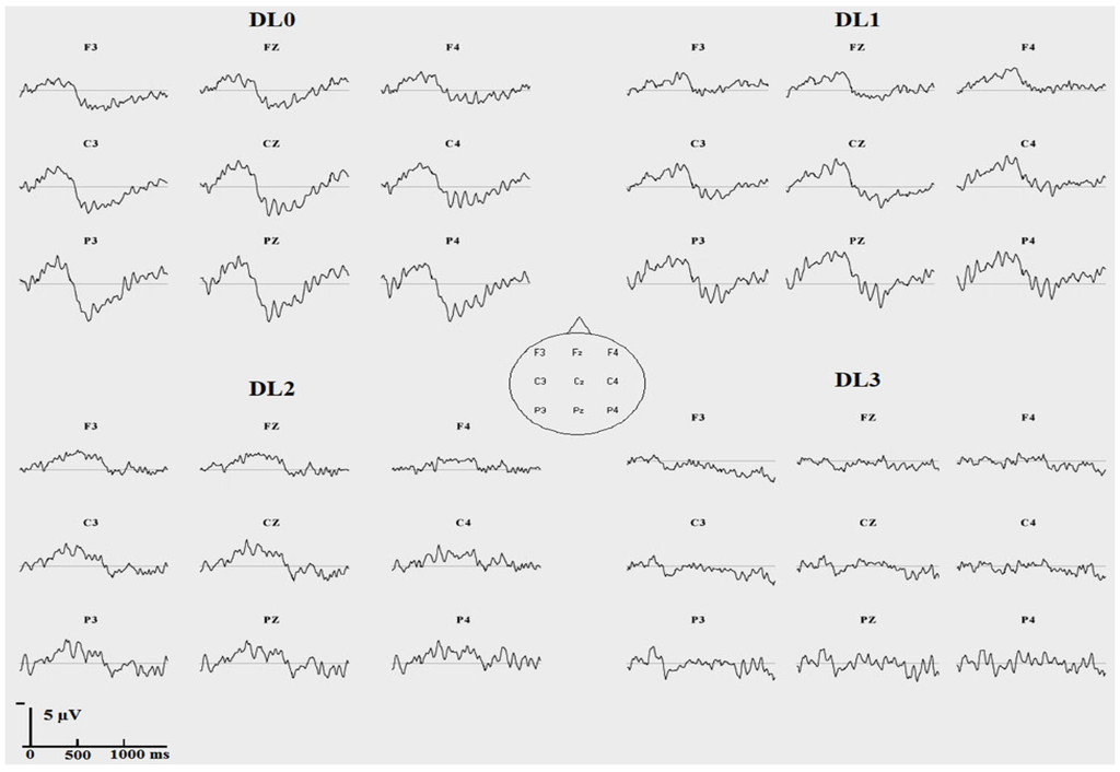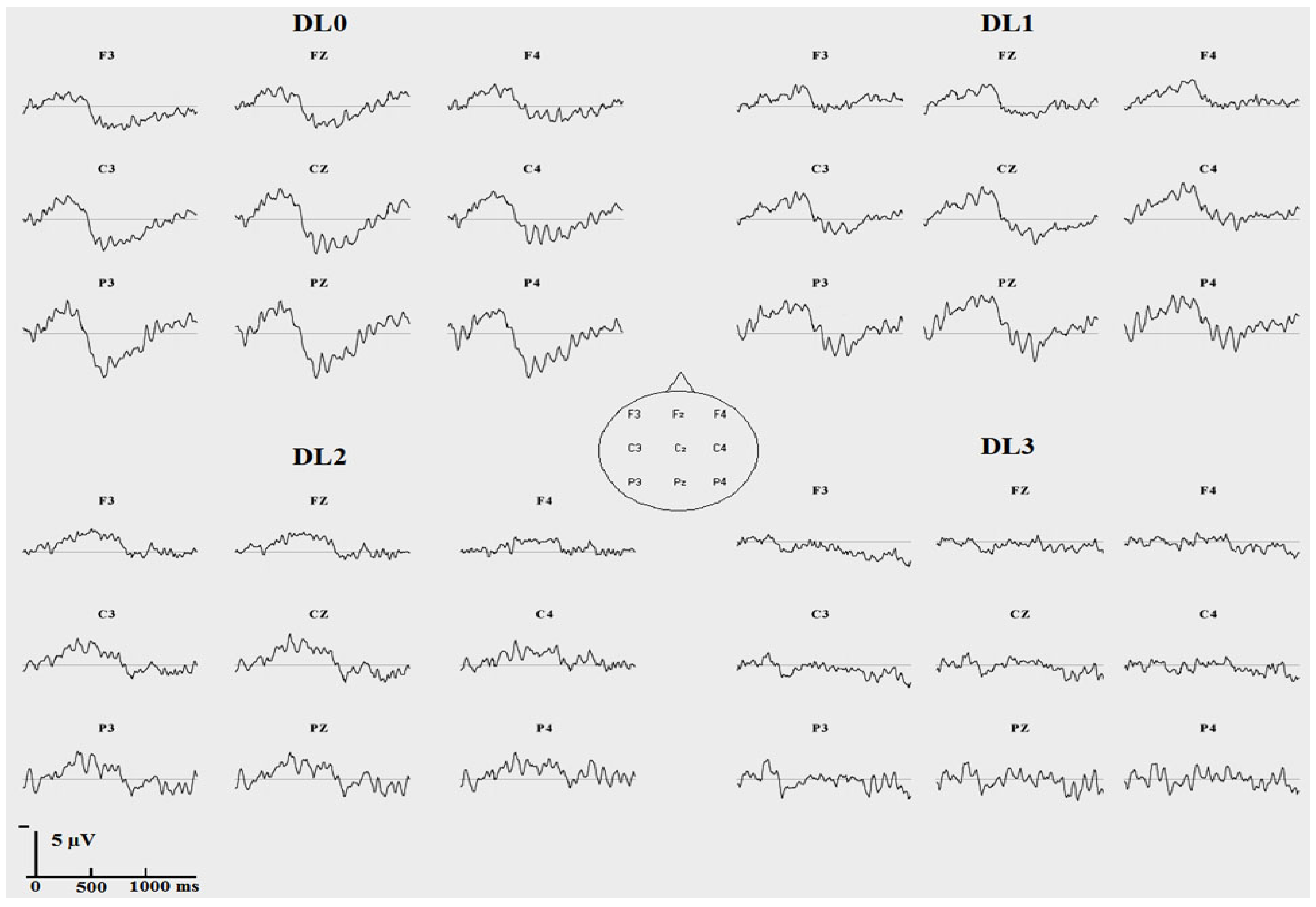 Grand averaged subtraction waveforms between ERP to incongruent targets and ERP to congruent targets at each degradation level (no degradation: DL0; “low” degradation: DL1; “medium” degradation: DL2; “strong” degradation: DL3) (N = 20 participants, vertical unit: µV with negativity upward, horizontal unit: ms).