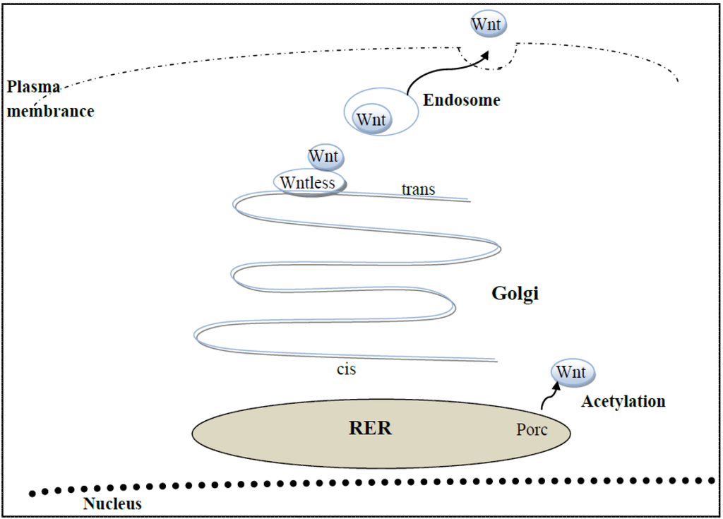 Wnts are secreted by astrocytes, neural stem cells or neural progenitor cells. Wnts are transcribed and translated and then acetylated by the acetyltransferase, Porcupine (Porc), in the endoplasmic reticulum. On the trans face of the Golgi, is a multimeric protein, called wntless, which aids in the transfer of Wnts to endosomes. Upon fusion of the two membranes, Wnt is secreted to the exterior of the cell.