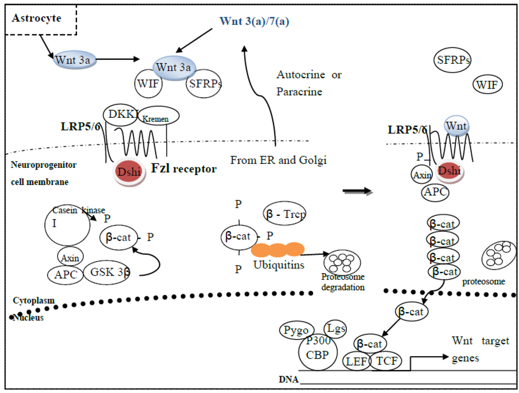 (Left) Wnt signaling is turned off when the ligand, although secreted by nearby astrocytes or neuroprogenitor cells, is bound by various Wnt inhibitors, such as Wnt inhibitory factor (WIF) and secreted fzl-related proteins (SFRPs). The fzl receptor remains bound by disheveled (dsh1) and LRP5/6 is bound by Dickopf (DKK1)-kremen complex, which helps anchor the complex into the membrane. With adenomatous polyposis (APC) and axin bound to casein kinase 1 and GSK-3β, these two kinases can now phosphorylate β-catenin, which is then sequestered by ubiquitins with the help of β-Trcp. β-Catenin is then degraded in the proteosome. (Right) Wnt signaling is turned on when Wnt binds fzl and the LRP5/6 co-receptor, promoting axin to dissociate from APC and dsh1 to phosphorylate LRP5/6. Meanwhile, casein kinase 1 phosphorylates GSK-3β, thereby inactivating it. β-Catenin then accumulates in the cytoplasm, enters the nucleus, where it binds to TCF/LEF and co-activators, such as pygopus (Pygo), legless (lgs), and P300/CBP, leading to the transcription of Wnt target genes.